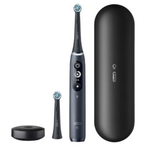 $248.54The Oral-B iO Series Rechargeable Toothbrush combines powerful, but gentle micro-vibrations with Oral-B’s unique dentist-inspired round brush head design for a professional clean feeling every day. 5 Smart Modes allow you to choose your ideal clean: Daily Clean, Whitening, Gum Care, Sensitive, and Intense. The Smart Pressure Sensor helps to keep you from brushing too hard to protect your gums and enamel, turning red when brushing too hard, and green when the pressure is just right for your teeth. AI Recognition enables 3D tracking to monitor your brushing across the front, top and back surfaces of your teeth across 16 zones of your mouth. The interactive display turns AI insights into action with real-time coaching. A 2-minute quadrant timer comes built-in that pulsates every 30 seconds, ensuring a complete clean. Our new, compact magnetic charger has click-in-place stability and provides a ~3 hour quick charge. This pack includes 2 Handles (White Alabaster and Black Onyx), 3 refill heads, 2 magnetic chargers, and 2 travel cases. Replace your Oral-B iO Series Replacement Brush Heads every 3 months for best results. The frictionless, smooth magnetic drive system transfers energy to the bristle tips for a clean that wows. Oral-B iO redefines the average brushing experience â a beautiful thing for healthy teeth and gums.