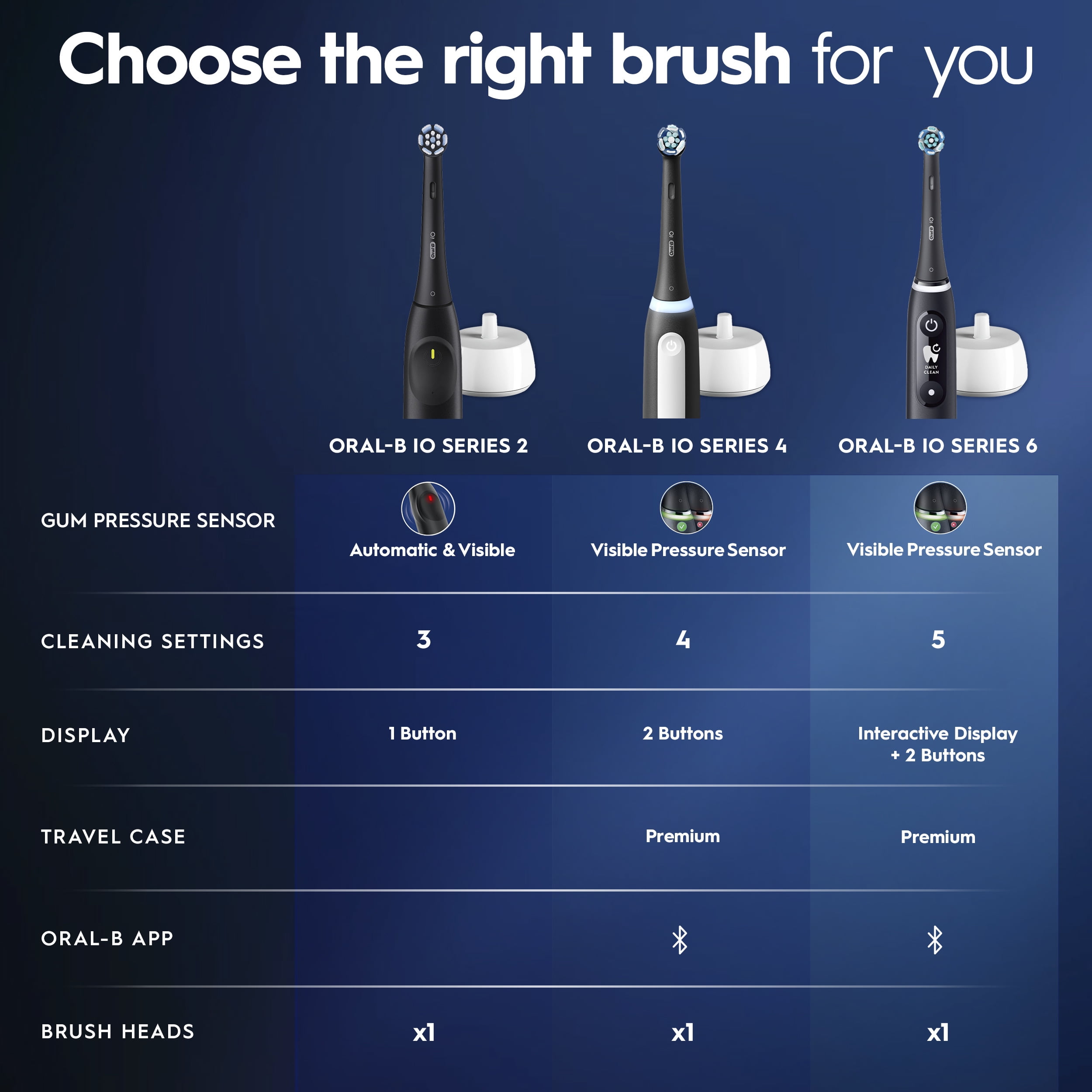 $60.19The iO is Oral-B’s best technology: Clinically Proven 400% More Plaque Removal Along Gumline versus a regular manual toothbrush. A Round head and gentle micro-vibrations, the Magnetic interaction delivers smooth, harmonious motion through a Synchronized cleaning action (micro-vibrations synced with oscillations). A Built-in-2-Minute Timer ensures an even easier experience, helping you get an optimal clean on all your teeth. The Oral-B’s quadrant timer breaks the two minutes up into four 30-second intervals to clean each quadrant of your mouth; we keep the time, so you don’t have to. Delivering the perfect pressure is done by having a Pressure Sensor. The Pressure Sensor Indicates optimal cleaning pressure and warns of over pressure. With an accompanying travel case, you’ll have a fresh clean everywhere you go. We’re with you on your next trip or even your mid-day on-the go brushing! Best of all, it is brought to you by Oral-B-the #1 brand used by dentists worldwide.* *Based on surveys of a representative worldwide sample of dentists carried out for P&G regularly. Do not use on children under age 3. Replace brush (head) every 3 months or sooner if brush head becomes worn.