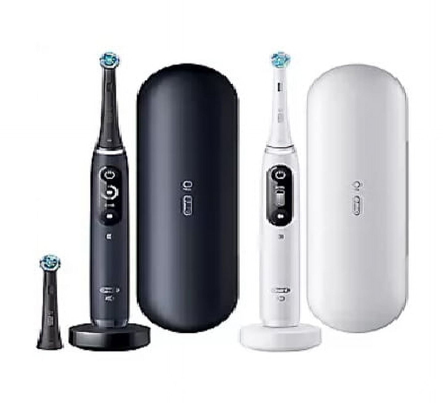 $248.54The Oral-B iO Series Rechargeable Toothbrush combines powerful, but gentle micro-vibrations with Oral-B’s unique dentist-inspired round brush head design for a professional clean feeling every day. 5 Smart Modes allow you to choose your ideal clean: Daily Clean, Whitening, Gum Care, Sensitive, and Intense. The Smart Pressure Sensor helps to keep you from brushing too hard to protect your gums and enamel, turning red when brushing too hard, and green when the pressure is just right for your teeth. AI Recognition enables 3D tracking to monitor your brushing across the front, top and back surfaces of your teeth across 16 zones of your mouth. The interactive display turns AI insights into action with real-time coaching. A 2-minute quadrant timer comes built-in that pulsates every 30 seconds, ensuring a complete clean. Our new, compact magnetic charger has click-in-place stability and provides a ~3 hour quick charge. This pack includes 2 Handles (White Alabaster and Black Onyx), 3 refill heads, 2 magnetic chargers, and 2 travel cases. Replace your Oral-B iO Series Replacement Brush Heads every 3 months for best results. The frictionless, smooth magnetic drive system transfers energy to the bristle tips for a clean that wows. Oral-B iO redefines the average brushing experience â a beautiful thing for healthy teeth and gums.