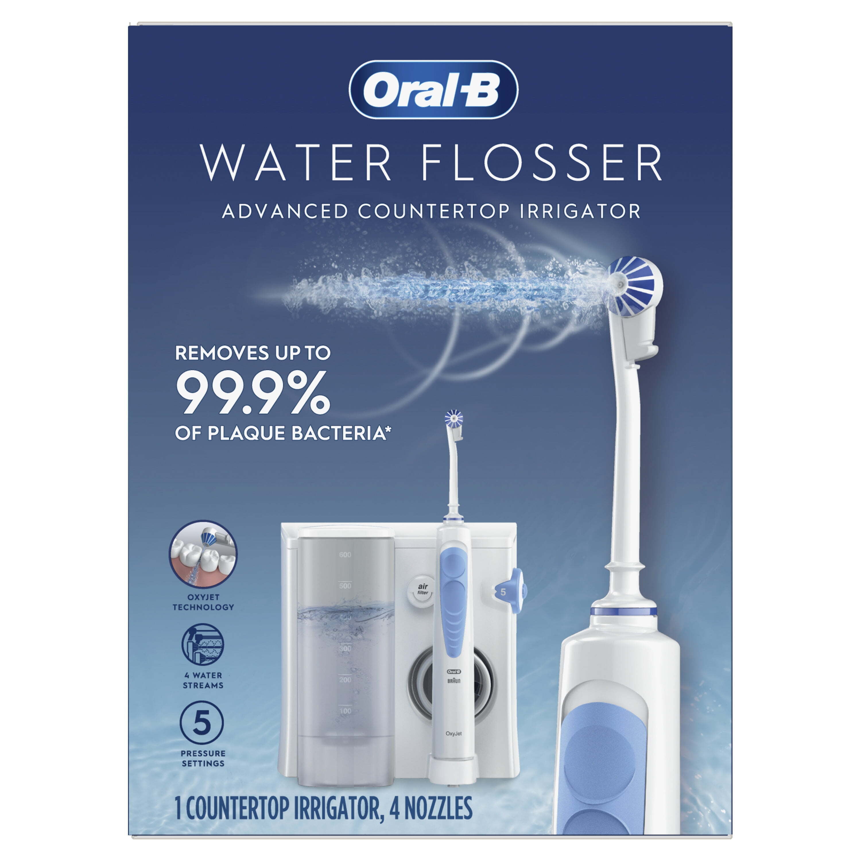 $60.15Oral-B Water Flosser, Oral Irrigator Handle with 4 Nozzles, White & Light Blue deep cleans and detoxifies below the gumline*. Its unique Oxyjet Technology uses water enriched with microbubbles of air to help eliminate plaque bacteria for healthier gums. The on-demand button gives you great control with less mess. Personalized streams allow for customized cleaning: Multi-Jet for all-around clean, Focused for targeted cleaning, Rotational for gum massage. *Helps reduce plaque bacteria and inflammatory components associated with gingivitis, when used as an adjunct to brushing, flossing and regular professional care.
