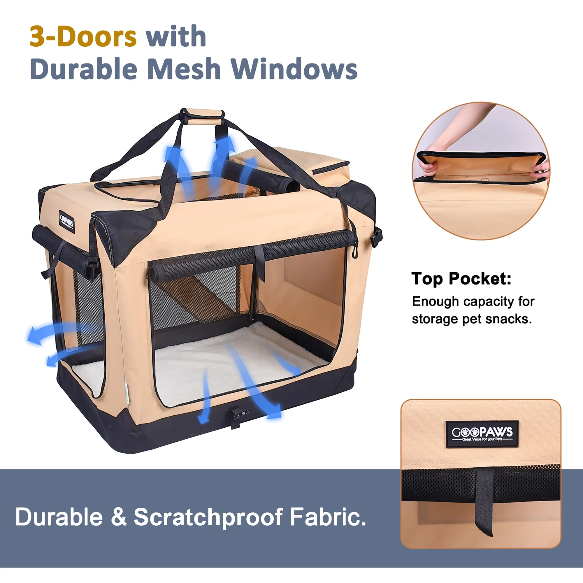 JESPET: 30″ Soft Pet Crate – Beige – Dogs & Cats Up to 50 lbs, 3 Door Folding Kennel, Indoor Outdoor Travel Carrier, Mesh Windows, Fleece Mat, GooPaws