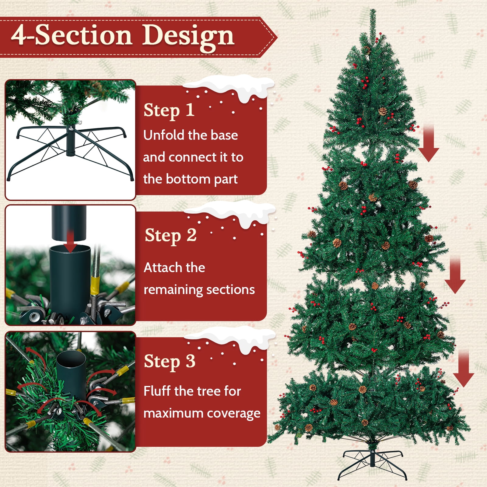 BSHAPPLUS 9 ft Pre-Decorated Christmas Tree with Pine Cones and Berrys,2800 Branch Tips,Artificial Holiday Xmas Tree with Metal Base,Green