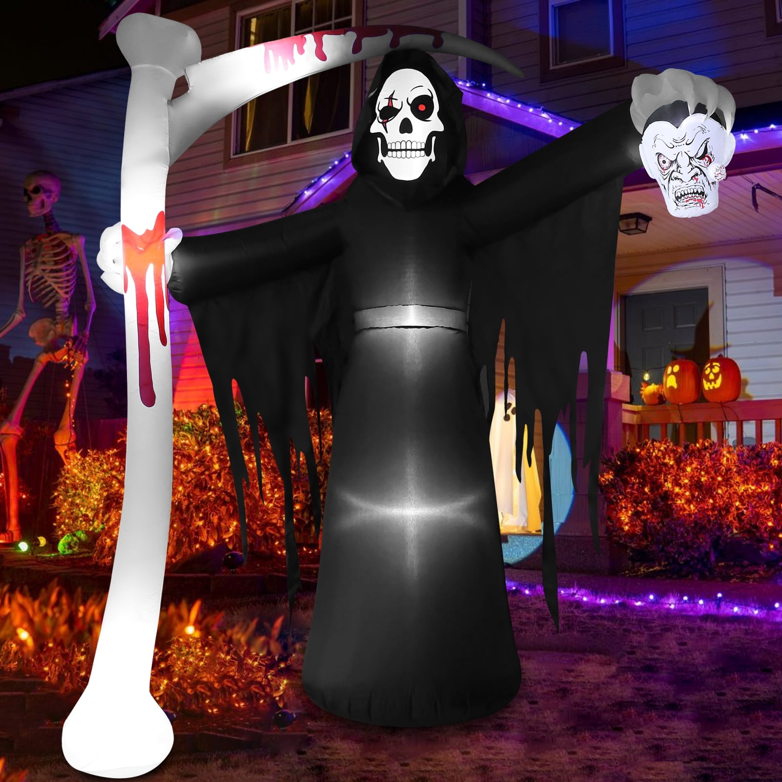 $40.41Original price was: $40.41.$34.39Current price is: $34.39.Features: This inflatable Grim Reaper is 9FT long, 3.3FT wide and 7.2FT high. It is huge in size and looks unique and creepy. Installed in the courtyard, it will fill your yard with a terrifying atmosphere of joy during Halloween. It will be your coolest outdoor decoration for Halloween this year. The package contains 3 water bags, 6 ground stakes and 2 ropes, which can be fixed on the ground very stably. No need to worry about this Halloween yard inflatable toy flying away with the wind. Perfect for your front yard, outdoor garden decorations, Halloween lawn decorations, trick-or-treating event decorations, Halloween night activities, Halloween costume parties, haunted house decorations, etc.! ✦BEST SALE SERVICE:We are committed to providing our customers with the best products.If you have any questions or concerns, please don’t hesitate to reach out to us. Our dedicated customer service team is here to assist you and ensure your satisfaction.