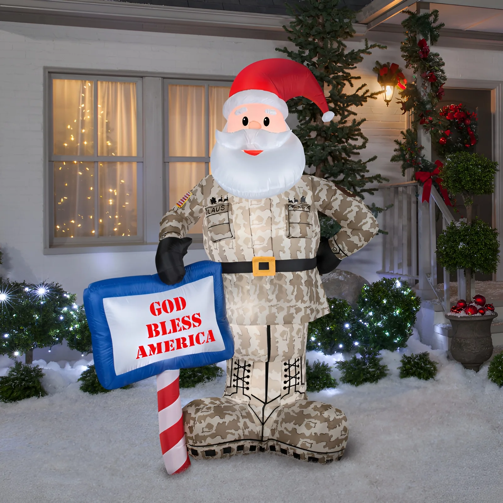$51.59Create a never before Holiday decor with this military Santa inflatable airblown decor. Crafted out of polyester, the multicolored accessory includes the airblown, its instructions, four tethers, four tether stakes, and four base stakes. Everyone is sure to marvel at your elegant embellishment this year. Product Features: Military Santa inflatable airblown decor. Includes airblown, instructions, 4 tethers; 4 tether stakes; 4 base stakes. Recommended for outdoor use. Care instructions: spot clean. Dimensions: 12.8″H x 24.41″W x 24.41″D. Assembled dimensions: 83.86″H x 57.09″W x 30.31″D. One size. Material(s): polyester