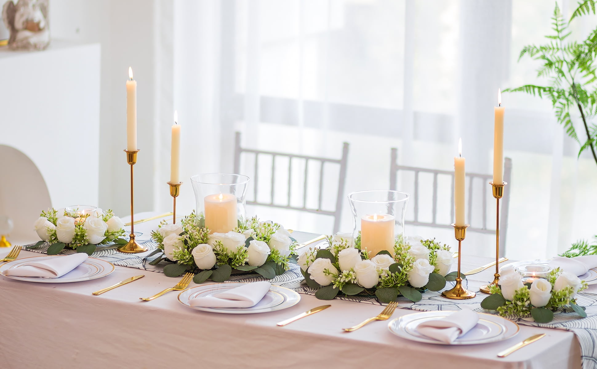 Blosmon Small Candle Rings Wreaths 10 Pcs 8.66″ White Artificial Flowers Wedding Centerpiece for Table Spring Summer Fake Rose Wreath for Front Door