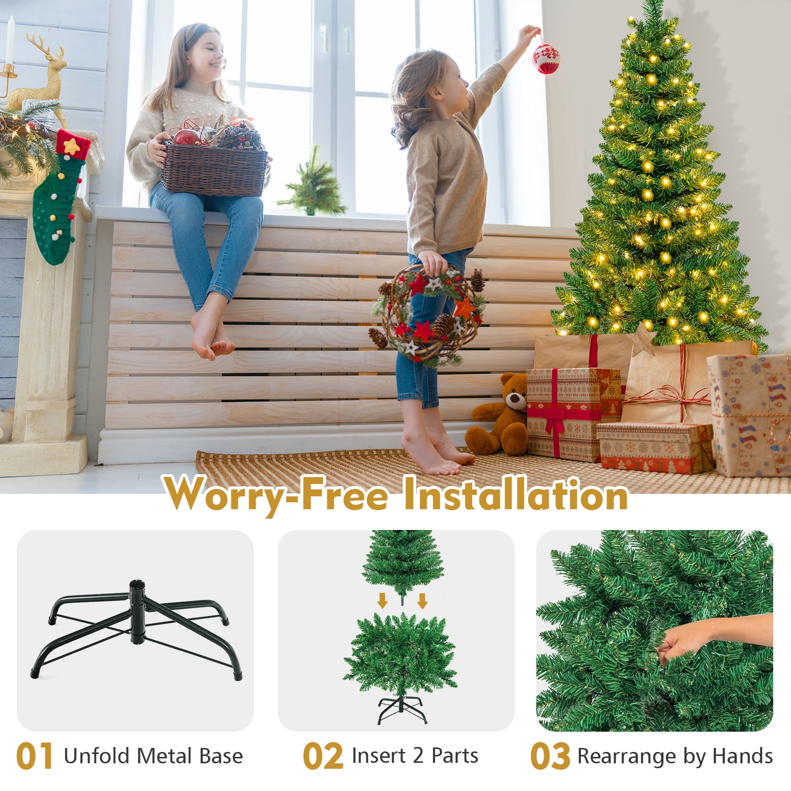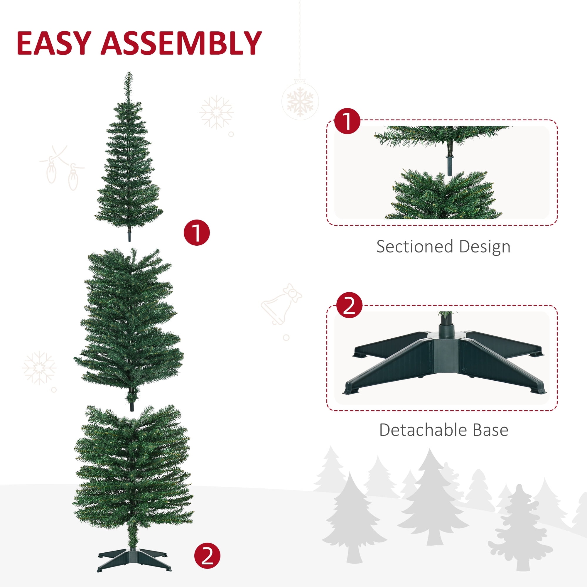 $42.99This is our 4.5 ft pre-lit pencil Christmas tree which is designed with 226 branch tips to offer a realistic and lush appearance. Pre-installed with 150 warm white LED lights, the slim tree saves you the hassle of hanging up the lights and help light up your room. It is effortless to make the tree fluff due to its hinged construction, while also facilitating its assemble and storage. Foldable X-shaped iron stand with foot pads prevents breakage and enhances the balance of the tree, offering stability to keep the wondrous tree standing all year around. Whether for your home, courtyard, or for commercial places like shops, hotels, the slim Christmas pencil tree is the perfect eye-catching decoration to add multiple fun and festive holiday fullness! Feature Pre-installed with 150 warm white LED lights for brilliant shine Slim pencil shape design takes up less space, ideal for any narrow place Crafted with 226 branch tips for leafy and realistic appearance Non-flammable and eco-friendly PVC material, not easily deformed All hinged construction convenient for assembly and storage Separated into 2 sections, easy to be placed in a tree storage bag X-shaped metal stand, wear and breakage resistant, offer more stability Foot pads effectively protect floors from scratching Simple style with plenty of space to hang ornaments as you like Eye-catching addition for homes, office, shops and other business places Match any style of room, add a rich Christmas atmosphere to you UL588 certified transformer for safer use Specification Color: green Main Material: PVC, iron Overall Dimensions: 1.9’x4.5’H Number of Tips: 226 tips Number of Lights: 150 Net Weight: about 5 Lbs Package Includes: 1xpre-lit Christmas tree 1xstand 1xadapter