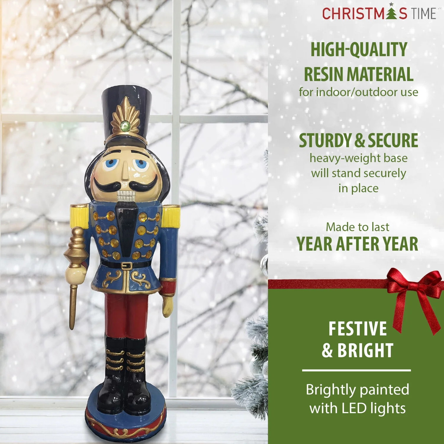 $287.88Deck your halls this holiday season with oversized resin decor from Christmas Time. Perfect for either indoor or covered outdoor use, our collection of resin statues will help you create a festive display that’s sure to impress friends, family, and carolers alike. Each intricately detailed item is crafted from weather-resistant resin then brightly hand-painted. Our impressive nutcracker greeter stands 36 inches tall and is prelit with 17 LED lights. Dressed in his blue coat, red pants, black boots, and tall black hat, he will add a special glow to your porch, entryway, fireplace hearth, or near the tree. For decorations that celebrate the magic of Christmas, count on quality products from Christmas Time.