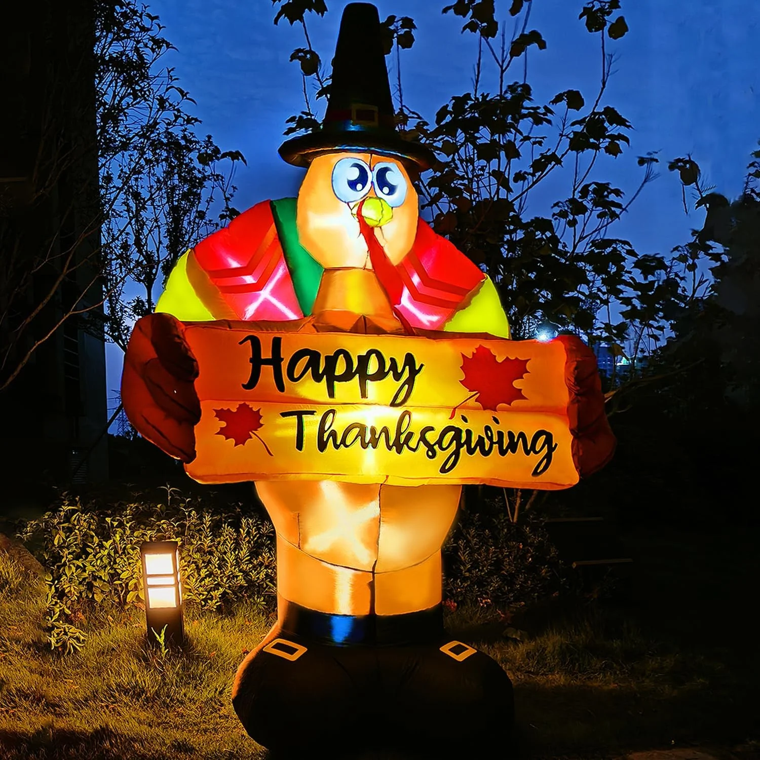 DeeKom 8′ Thanksgiving Inflatable Outdoor Decorations, Giant Blow up Turkey with Banner, Built-in LEDs for Lawn Yard Garden Party Festival Celebration