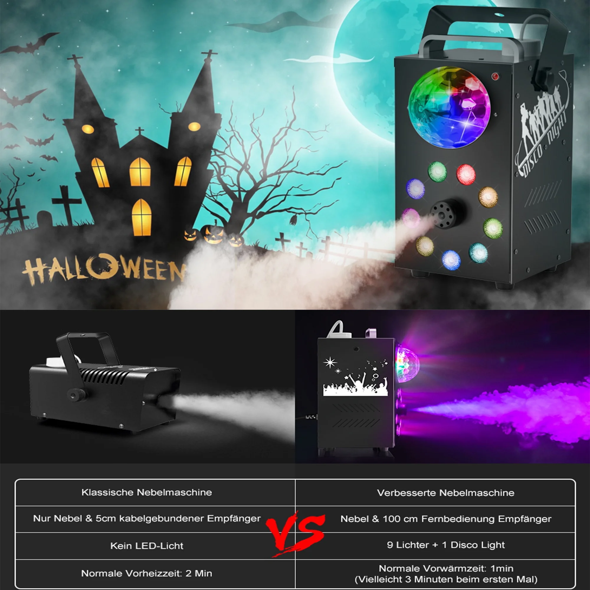 Halloween Fog Machine 700W Smoke Machine with Controllable 9 LED Color Lights and Disco Ball Lights for Christmas Wedding Party