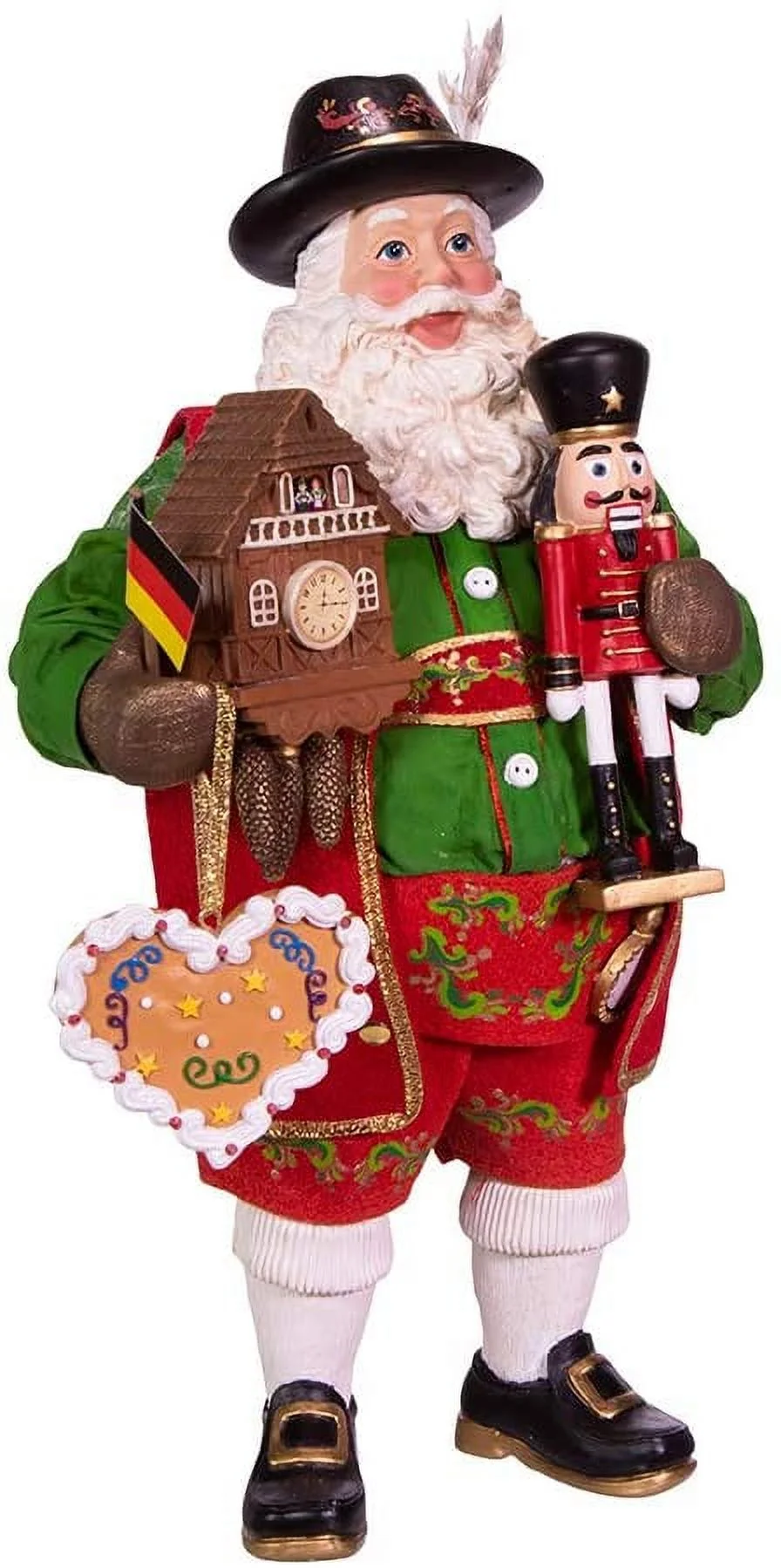 $111.79Original price was: $111.79.$57.61Current price is: $57.61.This 11-Inch Fabriché™ Musical German Santa from Kurt Adler is the perfect addition to any German household. This Santa is featured in the classic red and green Christmas colors. In his left hand is a nutcracker. His right hand holds a simple Cuckoo clock, heart shaped ornament and the flag of Germany. When activated, the tune “O Christmas Tree” plays.