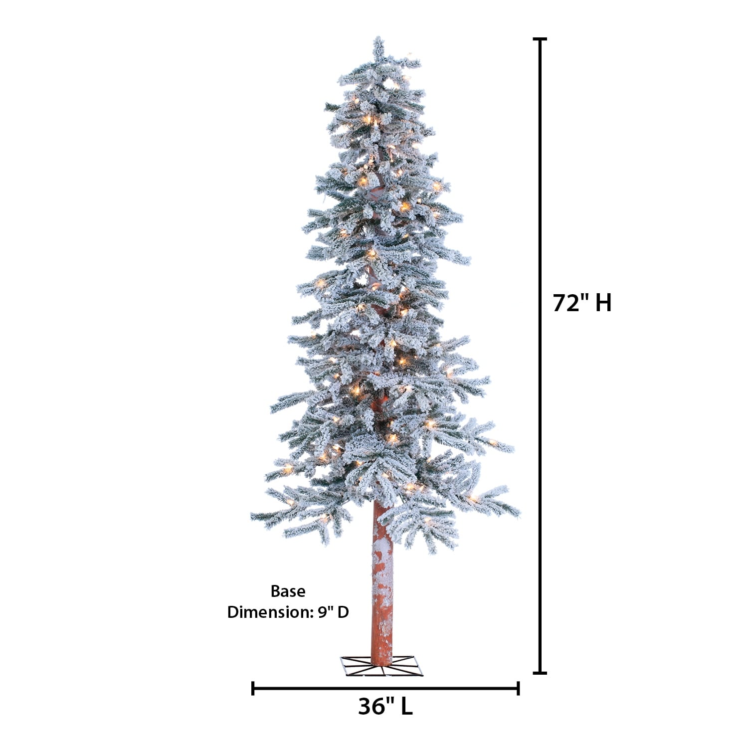 $92.82Sterling Experience the true joy of Christmas with this beautifully flocked Alpine tree sporting a real wood trunk. At a convenient 6-foot height, and with a classic Alpine shape and a trim base diameter of 30-inches, this stunning Alpine comes with 150 clear incandescent bulbs to add a warm, hearth-and-home glow, but without the mess and fire dangers of a live-cut tree. Safe, fire-resistant needles provide an amazing 657 Alpine branch tips to put your favorite ornaments on display. It’s an eye-catching centerpiece providing the cheer to make your holidays a lasting memory. Comes with a 9-inch diameter sturdy four-prong stand for safety and stability.