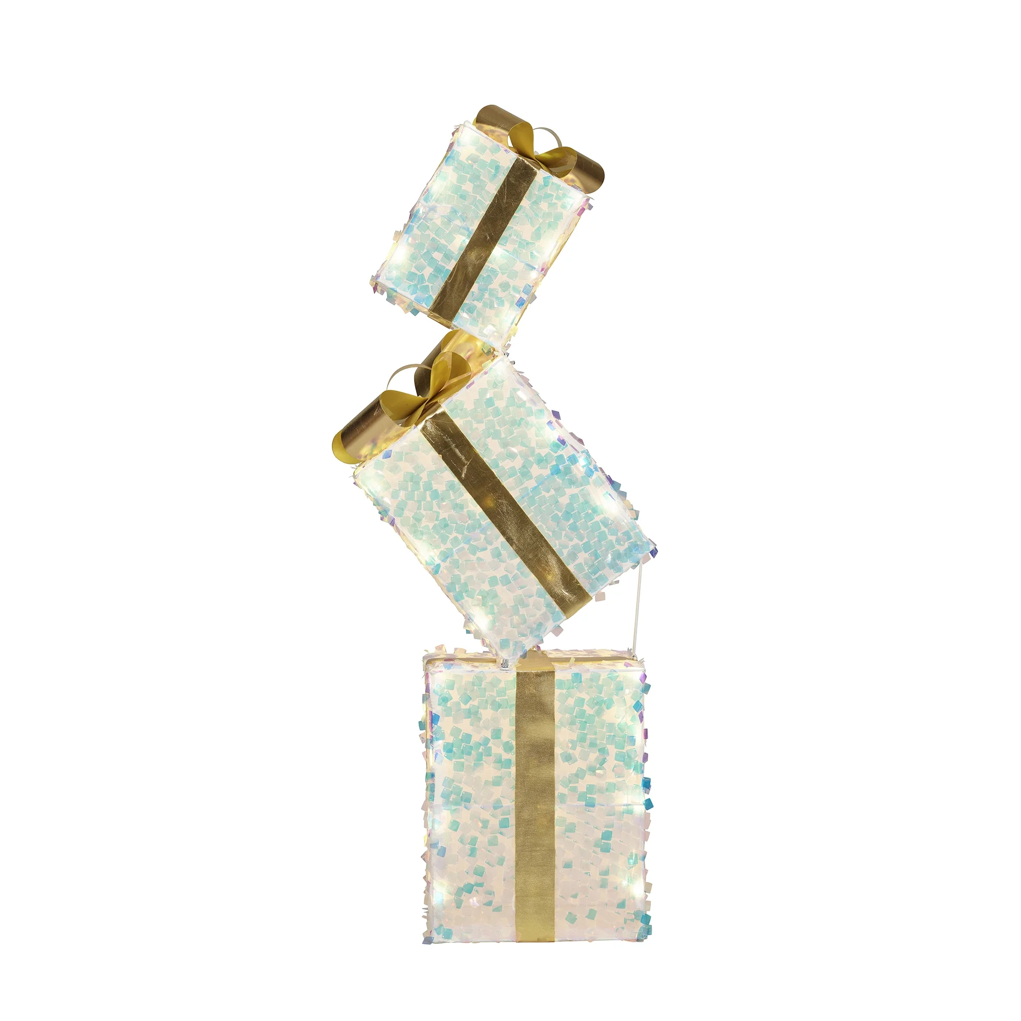 Light-up Stacked Sequin Gift Boxes with 60 Warm White LED Lights, 42″, Holiday Time