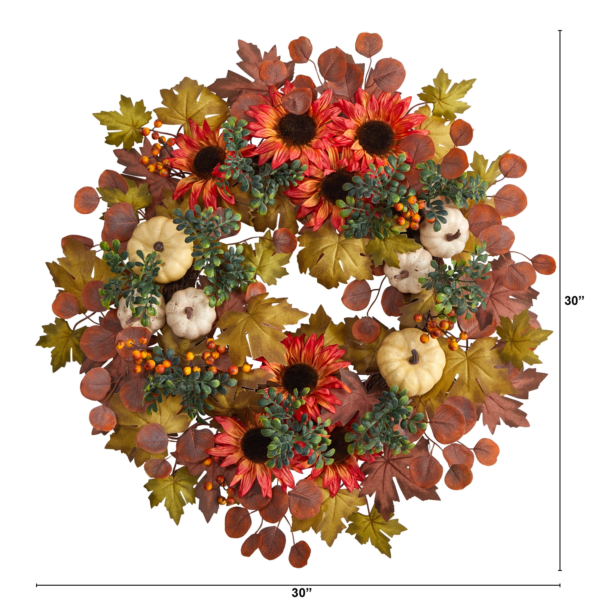 $57.21Nearly Natural Embrace those chilly harvest nights with this Pumpkin, Sunflower, Maple Leaves Artificial Wreath. Who says the harvest can’t be chic. The messy yet rustic look of this wreath creates a focal point in any space. Inspired by nature, assembled from high-quality materials, inject the fall foliage into your room. With a diameter of 30in., house in any space that needs a festive cheer. This item will need to be re-shaped when removed from the secure box to allow it to reach its fullest size. Your wreath will look beautiful for years to come.