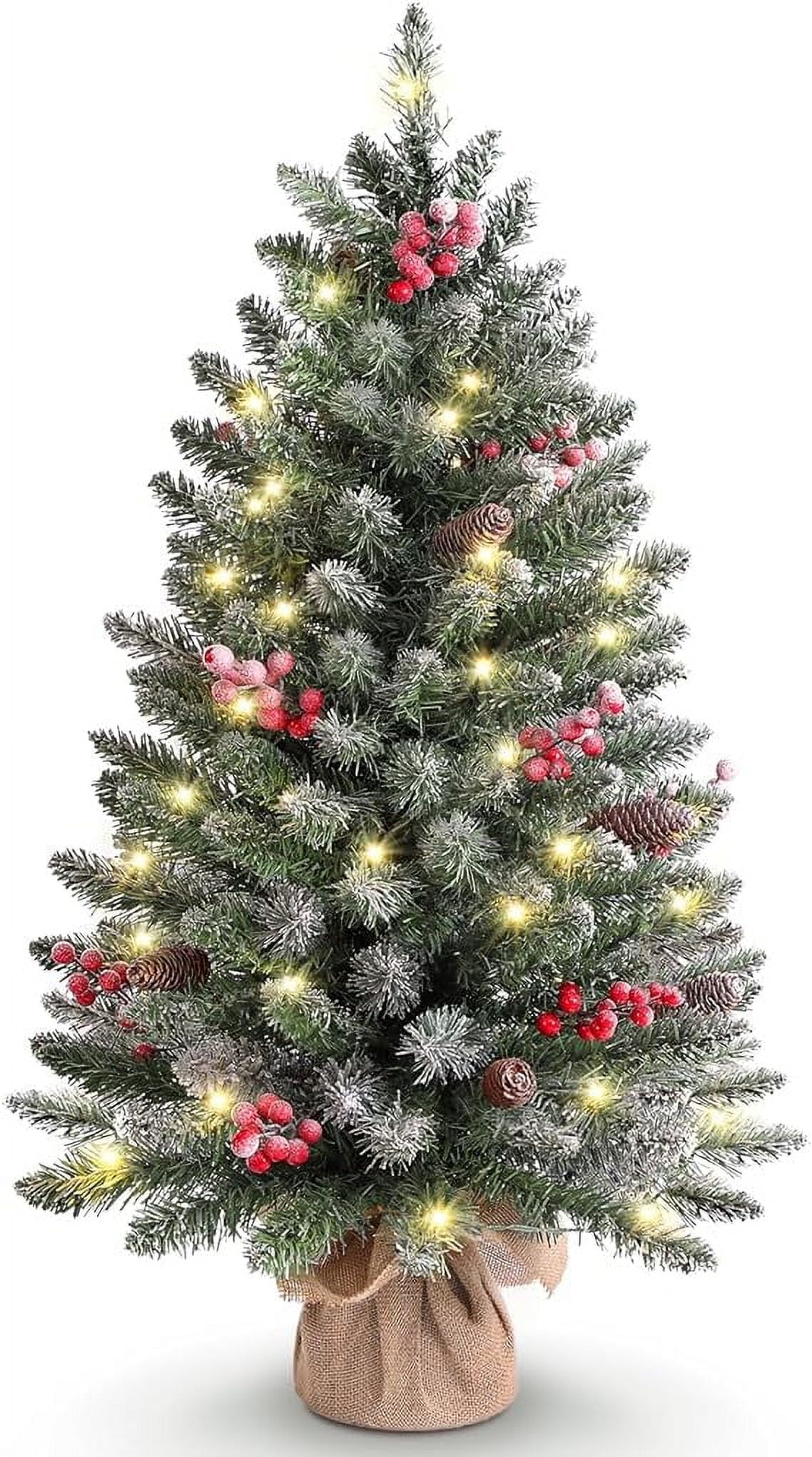 OasisCraft 3ft Tabletop Christmas Tree, Pre-Lit Xmas Tree with Cloth Bag Base, Mini Christmas Tree with LED Lights, Artificial Christmas Tree with Pine Cones Red Berries