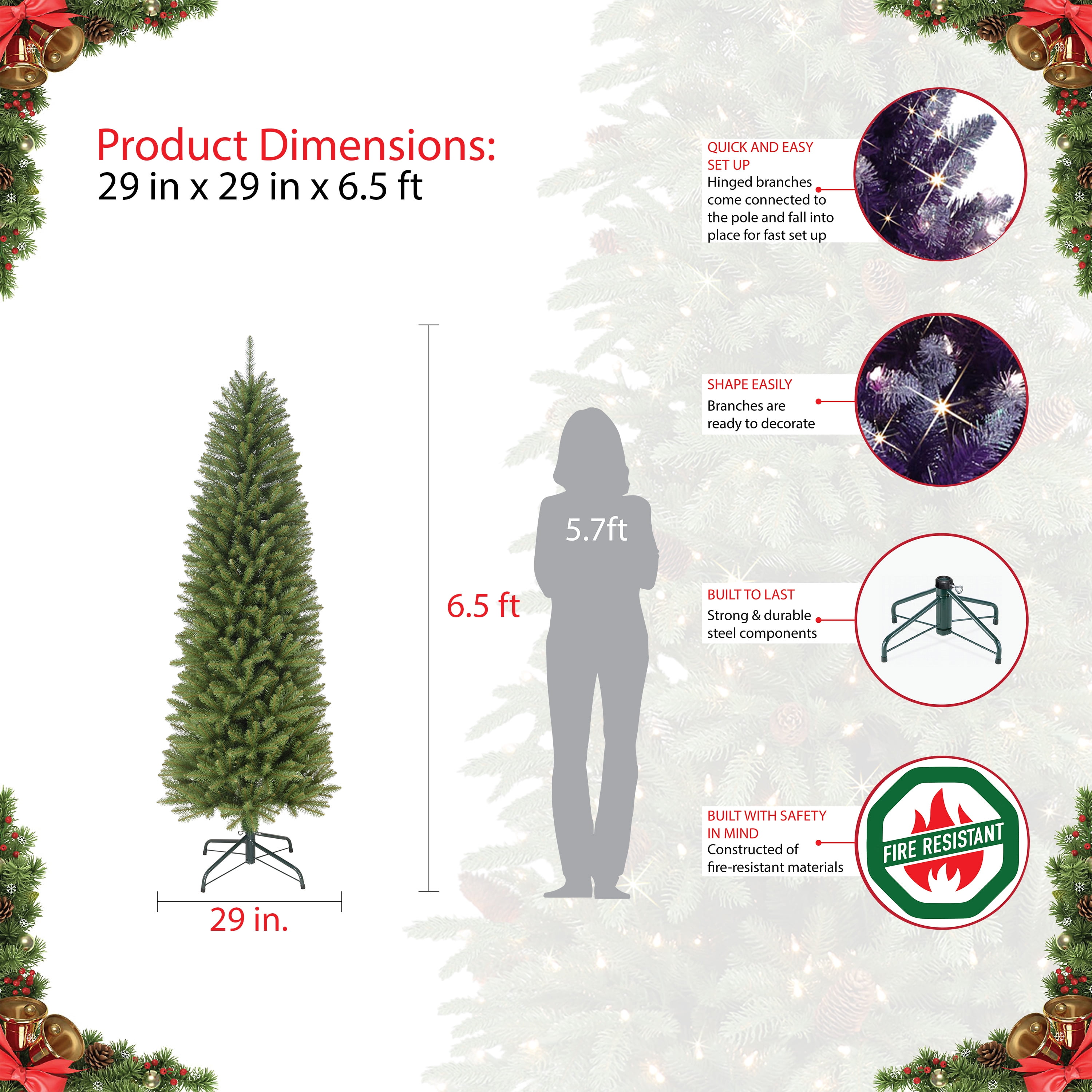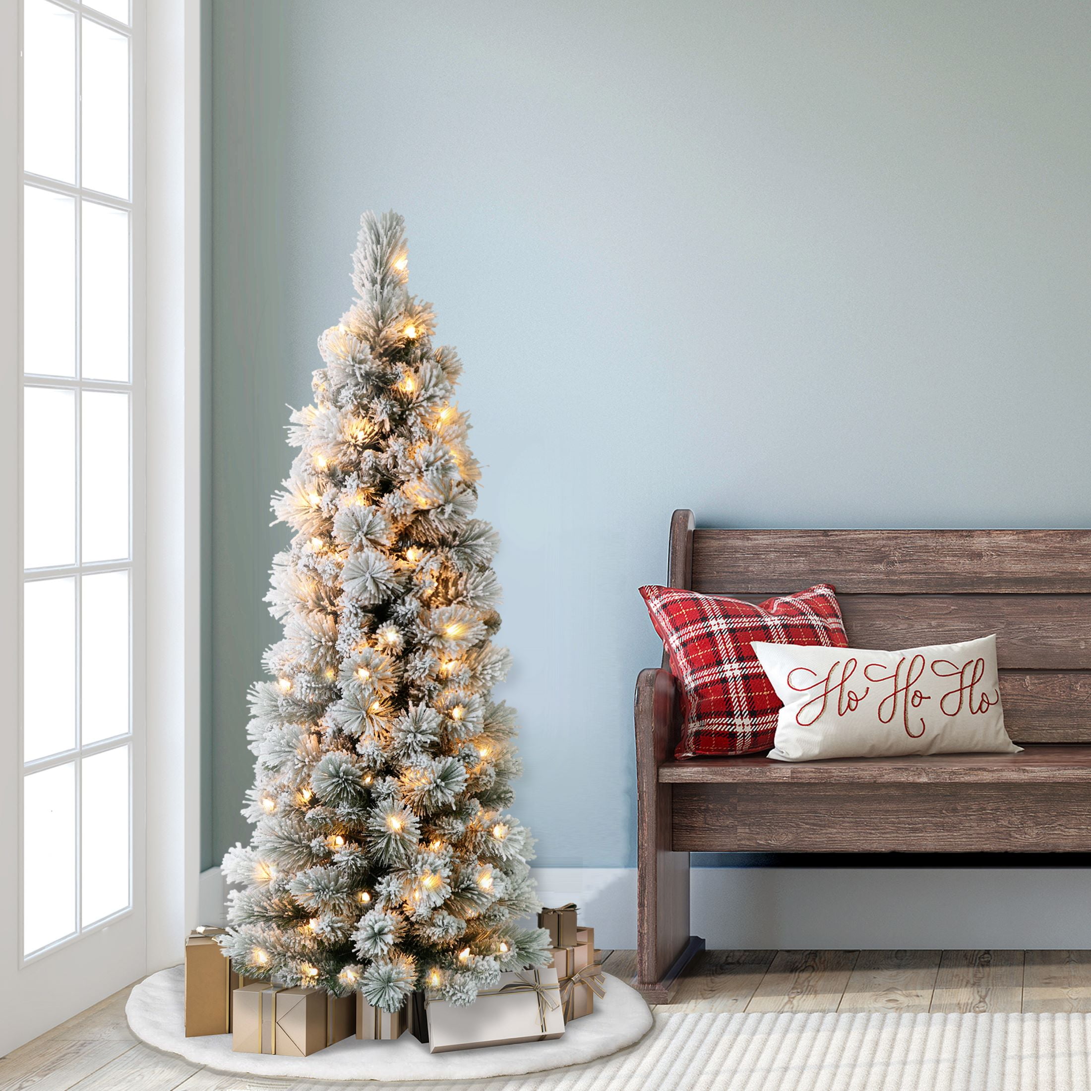 $51.59Deck the halls with the Puleo International 4.5-foot Pre-Lit Flocked Portland Pine Pencil Artificial Christmas Tree. Inspired by lush wintry forests, this artificial tree has 195 branch tips and 100 Incandescent Clear Lights. The incorporated lights means no more climbing ladders to string lights, saving decorating time. When a single bulb burns out, the other lights on the strand will stay lit for your convenience. We recommend changing the burnt bulb to prevent future outages. Hypoallergenic and needle-shed resistant, the tree is an great alternative to a yearly real tree purchase. With easy to assemble pieces and an included base, your house will be ready for the holidays faster than you can say “Rockin’ Around the Christmas Tree”. Measures. 4.5 Foot High x 16 Inch Diameter. lbs