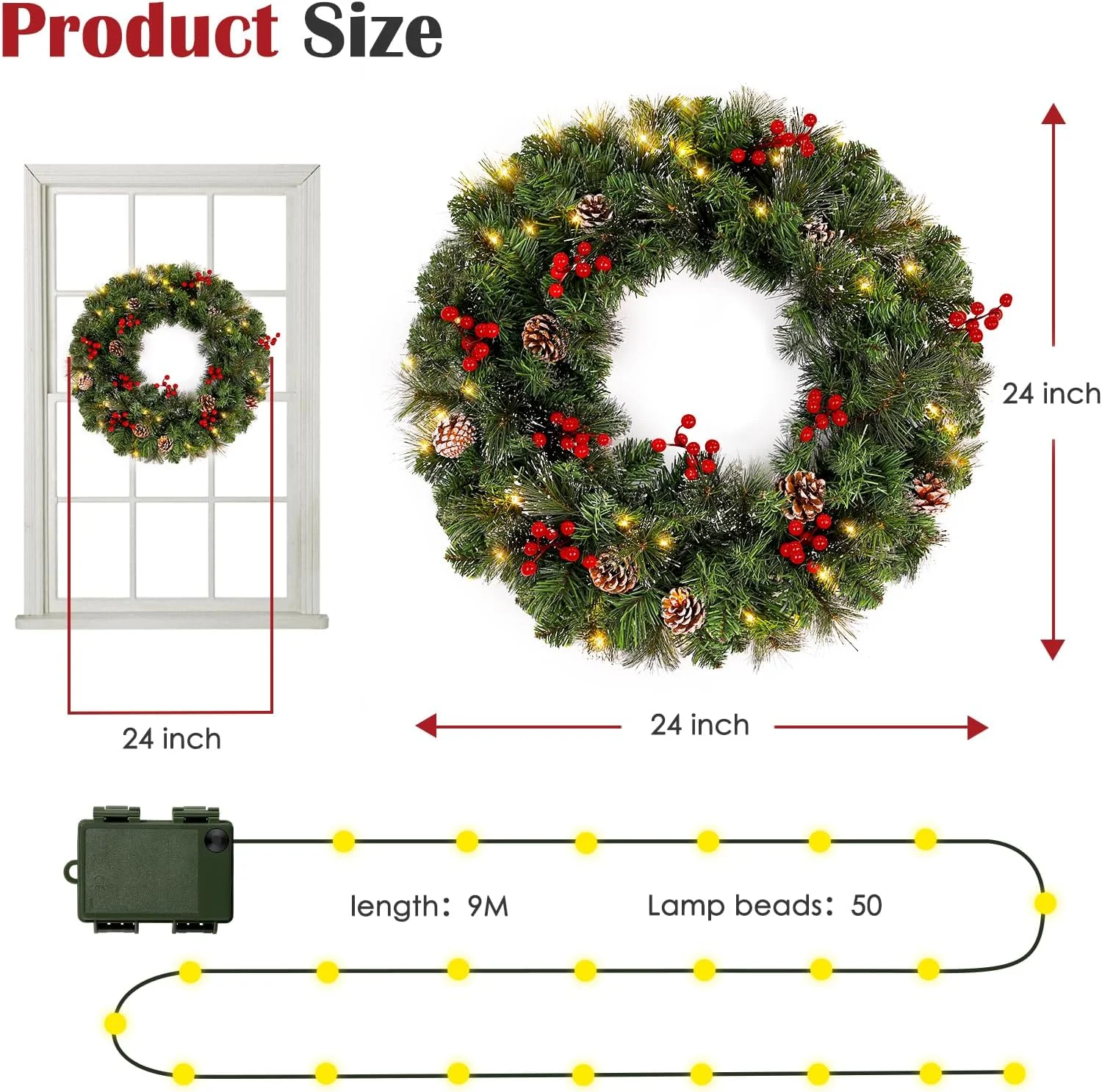 $34.3924inch Extra Large Deluxe Commercial Grade Christmas Wreath: Our lighted Christmas wreath measures approx. 24 inch (from the widest to the widest). Inner size of this wreath measures approx. 11 inch. Ideal size, superior texture and sturdy construction, a must-have holiday wreath for this Christmas/New Year’s holiday. Plug-in Lighted Christmas Wreath with Lights, Say Goodbye to Dim Lights: This Christmas wreath is powered by electricity, plug directly into outlet with a 10ft power cable, no adapter or battery required, pre-lit lights ensure it will super bright. With its reliable power source, this wreath provides superior stability and brightness, ensuring a consistently radiant display unlike traditional battery-operated wreaths. Heavy-duty Wreath with Ruby-Red Berries, Rustic Pine Cones, Christmas Flowers, Shining Ornaments: Our versatile stunning, full, and lush holiday wreath uses over 100 individually crafted branch tips, it is designed to add a warm and festive touch to your holiday decor and create wonderful memories for your family and friends. It complements various decoration styles and is suitable for adorning the front door, window, fireplace, and fence. Handcrafted with High-Quality Materials for Outdoor/Indoor Use: This Christmas wreath is skillfully handcrafted using top-notch materials, ensuring its exceptional quality and longevity. Its lush appearance, durability, and lifelike design make it a perfect choice for both outdoor and indoor settings. You can count on its enduring beauty to enhance your holiday decor for many Christmas seasons to come. Pre-lit Christmas Wreath, Save Your Time and Effort: Save you time and effort in installation and decoration, super bright at night. Since the lights are already installed on the wreath, you don’t need to purchase, install, and arrange the lights separately. This allows you to complete your Christmas decoration more quickly while reducing potential hassle and frustration. Note: This Christmas wreath will arrive in a folded state, please adjust the branches to its full size. Test before installation, please check the lights and plug. Specifications: Dimension: 24 inch (Diameter) Material: Wire, PVC, Fiber Optic Power Source: 12V Plug Power Cable: 3 feet Light Color: Warm White Package Include: 1 x 24 inch Pre-lit Christmas Wreath