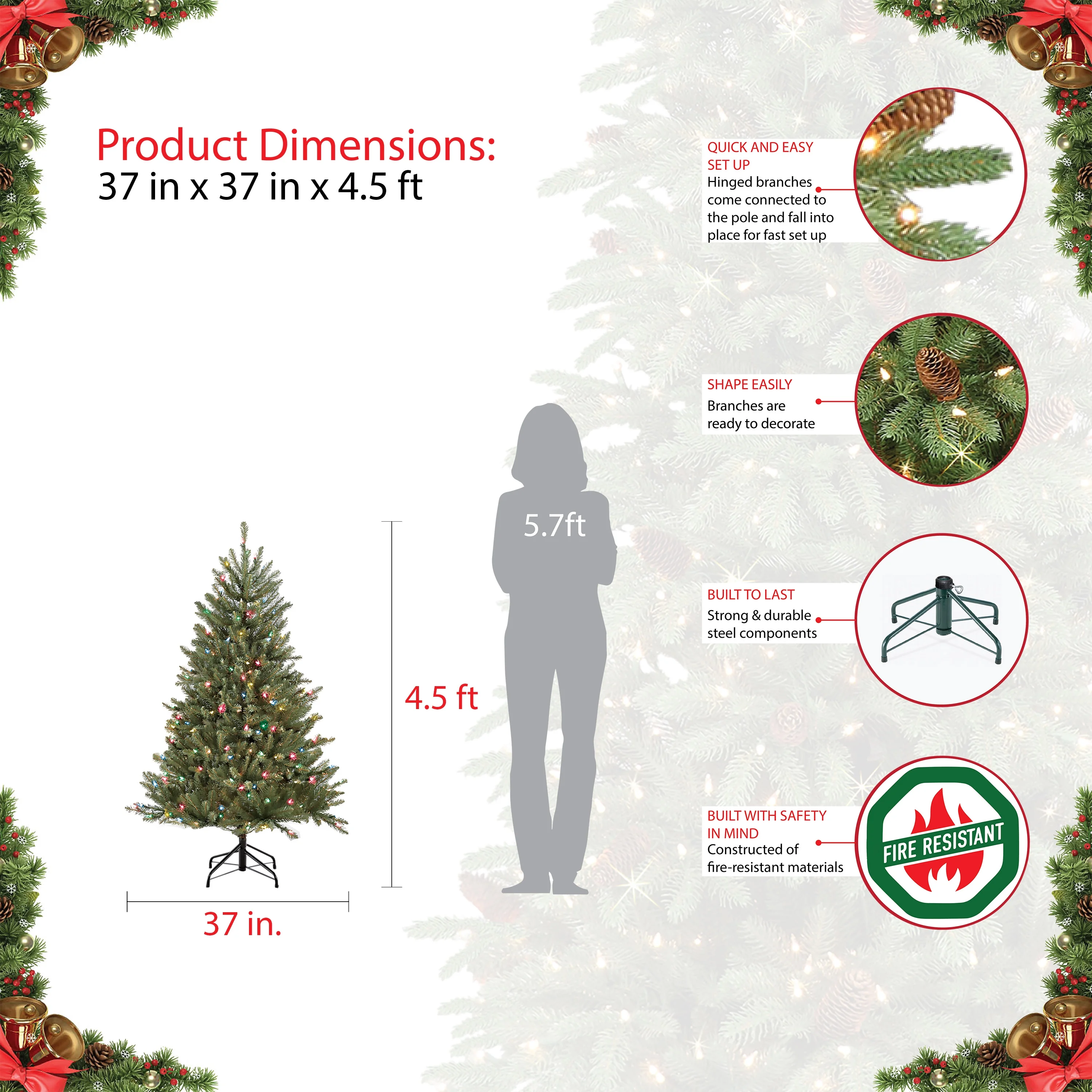 $78.27During the holiday season your home is not complete without the addition of a Puleo Christmas Tree. Puleo is The Oldest Family Name for Christmas Trees in America and our trees will bring joy and holiday spirit year after year. Puleo Christmas trees are hand crafted using only the highest quality materials to achieve an incredibly realistic appearance.. . Our 4.5 foot tall Fraser Fir features 761 branch tips with room for many treasured Christmas ornaments, and 250 Clear lights that warmly illuminate the room… If one light goes out, the remainder stay lit… Product Features: Clear Lights, Pre-lit Height: 4.5 Foot Dimensions: 4.5 feet x 37 inches in diameter.