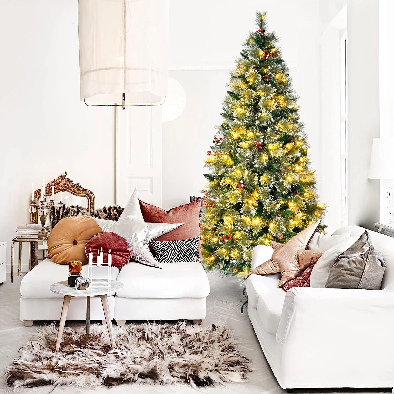 SUGIFT 6.5ft Pre-Lit Premium Pine Artificial Christmas Tree with Red Berries, 200 LED Lights, Green