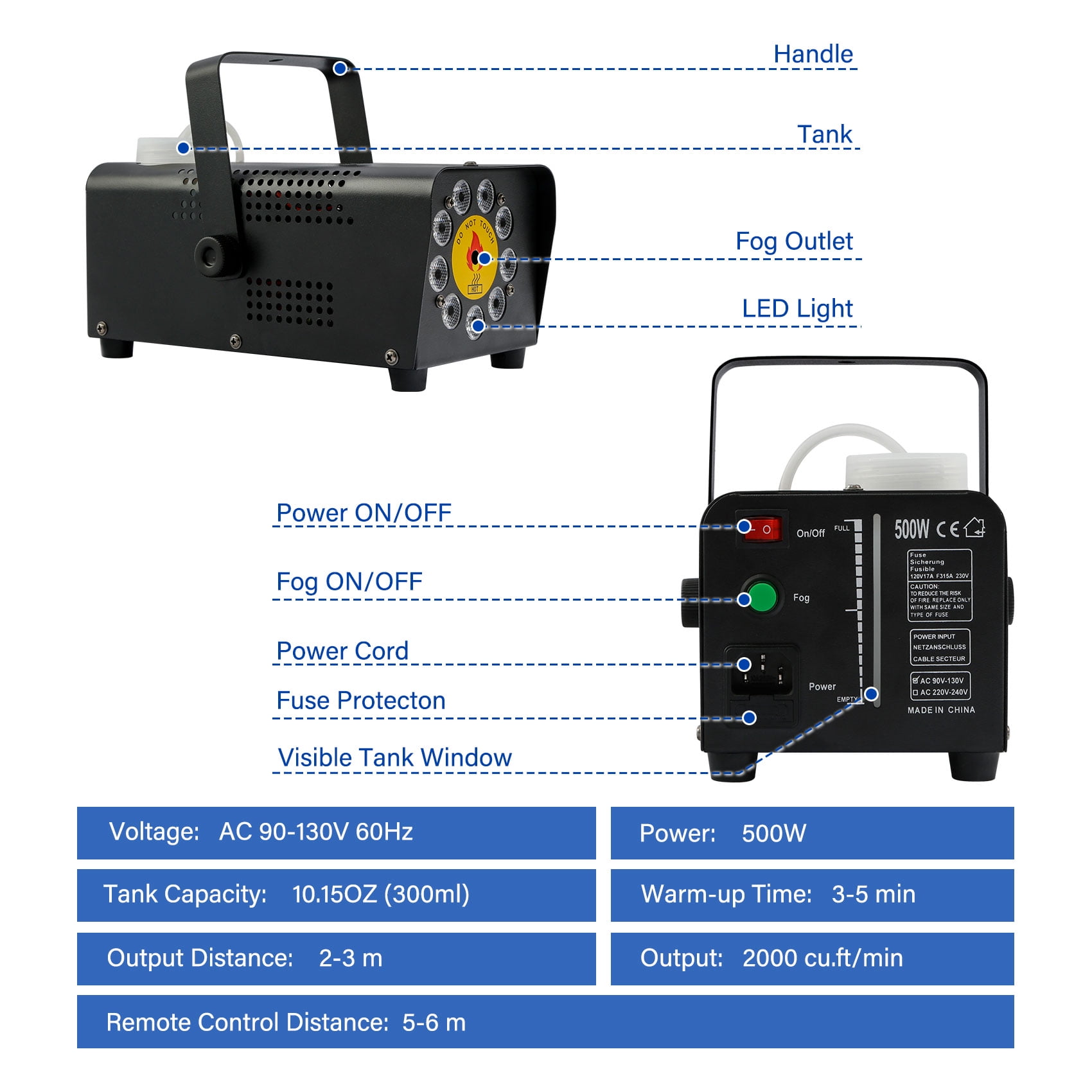 TCFUNDY 500W Fog Machine w/ LED RGB 9IN1 Fogger Smoke Maker with Wireless Remote Controller