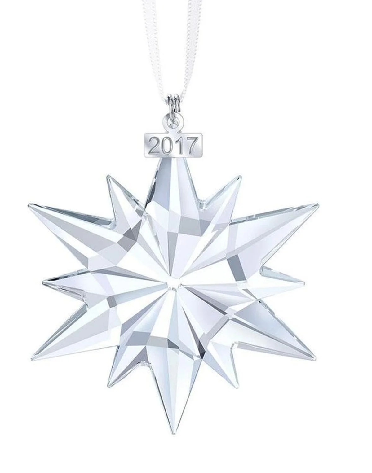 $81.69The Swarvoski Annual Edition Ornament 2017 5257589 is only available during the holiday season. This elegantly designed item can make a wonderful addition to a collection or can also make a memorable gift. The 2017 Christmas ornament can be given to mark special occasions such as births, weddings, anniversaries and more. It is shaped like a fancy star and is crystal clear in color. This allows for it to reflect and shine near Christmas trees, making it a beautiful display. This ornament also comes with a white satin ribbon that is durable enough to hang safely on real or artificial branches.