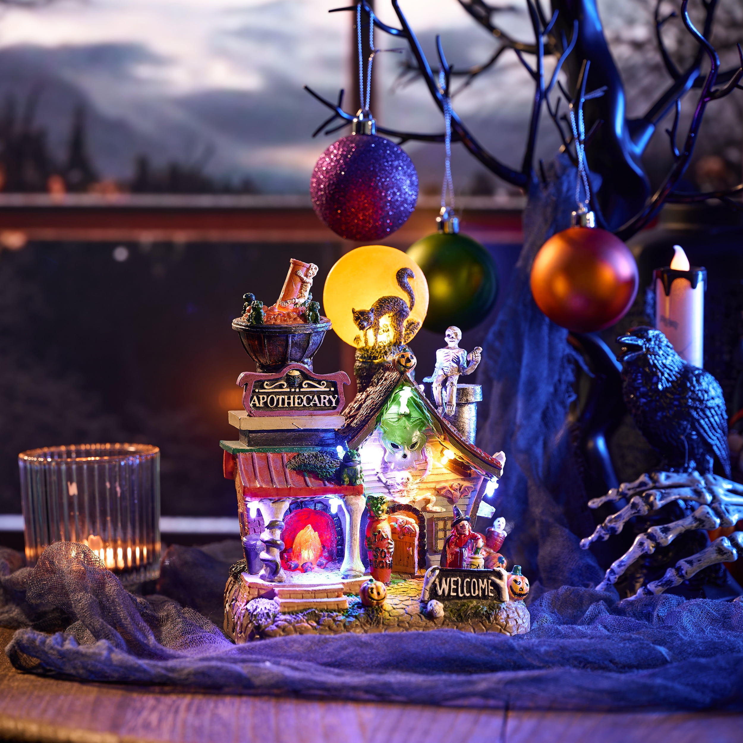 Valery Madelyn 8.08 inches Halloween Village Halloween Apothecary Haunted House Decoration with Black Cat, Skeleton, Pumpkins, Witch and Music, Lighted Halloween Village for Spooky Party Decor