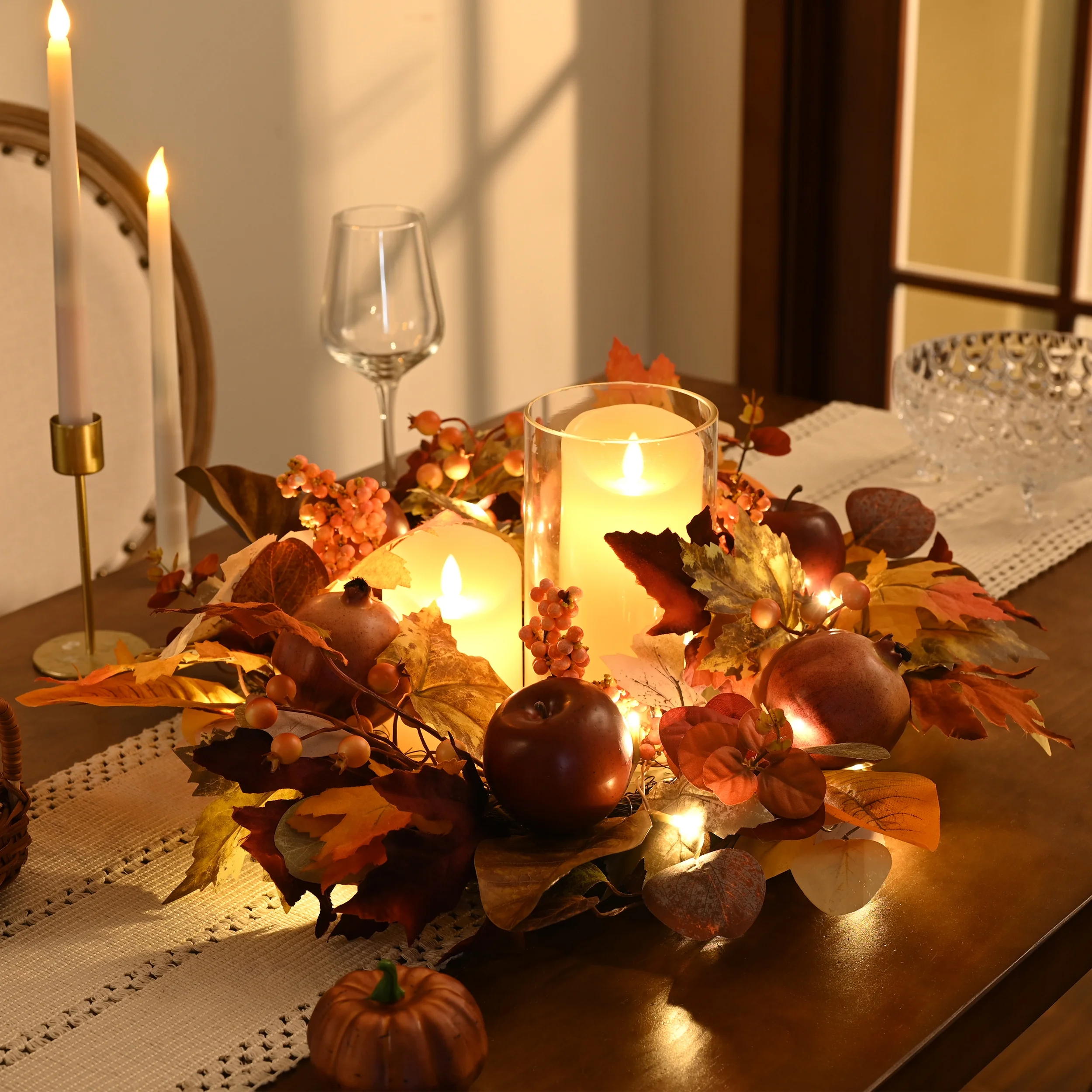 Valery Madelyn 24 Inches Pre-Lit Fall Wreath Lighted Thanksgiving Wreath with Pomegranate & Apple Fall Wreath for Front door Indoor Fireplace Farmhouse