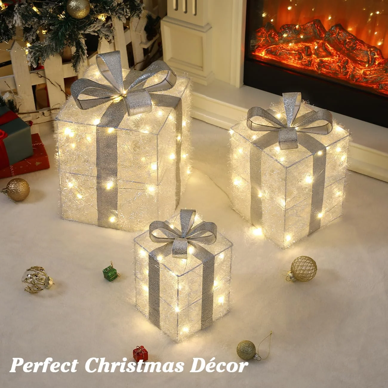 $42.13💗Christmas is everyone’s favorite holiday! Wishing you all the Christmas blessings.Our Christmas Gift Boxes are very suitable as a Christmas gift for your lover, friends, and colleagues. Children can’t wait to decorate all the gift boxes under the Christmas trees. Perfect for Outdoor Decorations, Sure to Earn Your Neighbors’ Admiration Meet Your New Favorite Christmas Decor The Perfect Finishing Touch for Christmas Christmas is approaching, are you still struggling with how to dress up your house to be full of Christmas spirit? Then this LED-lighted box decor set is undoubtedly a good choice for you! They are designed to look like 3D gift boxes, embellished with white streamers and pretty bows. Exquisite in appearance, it is sure to receive compliments from your friends or family. Let the laughter and joy of Christmas linger in your space. You can stack them or lay them flat in any corner you need to decorate, such as under the Christmas tree, bedroom, living room, porch, etc. Pretty ornaments for Christmas or daily activities. 📝Item Specifications: Large Box: 9.84 x 9.84 x 11.81 inch / 25 x 25 x 30 cm Medium Box: 7.87 x 7.87 x 9.84 inch / 20 x 20 x 25 cm Small Box: 5.91 x 5.91 x 7.87 inch / 15 x 15 x 20 cm Warm Tips: Non-waterproof battery case, recommended for indoor use.Solid Metal Frame The frame made of reliable metal turns these lights into durable decorations. Accompany you through different holiday celebrations year after year. Solid Metal Frame The frame made of reliable metal turns these lights into durable decorations. Accompany you through different holiday celebrations year after year. Batteries Powered Powered by 3 x AA batteries(NOT included), safe and durable, no risk of electric shock. Ideal for families with pets and little ones. Warm Light Beads Embedded with 90 mini LED bulbs to make these gift box decorations even more fascinating. Brighten up your dimly lit space and add a chic holiday vibe.