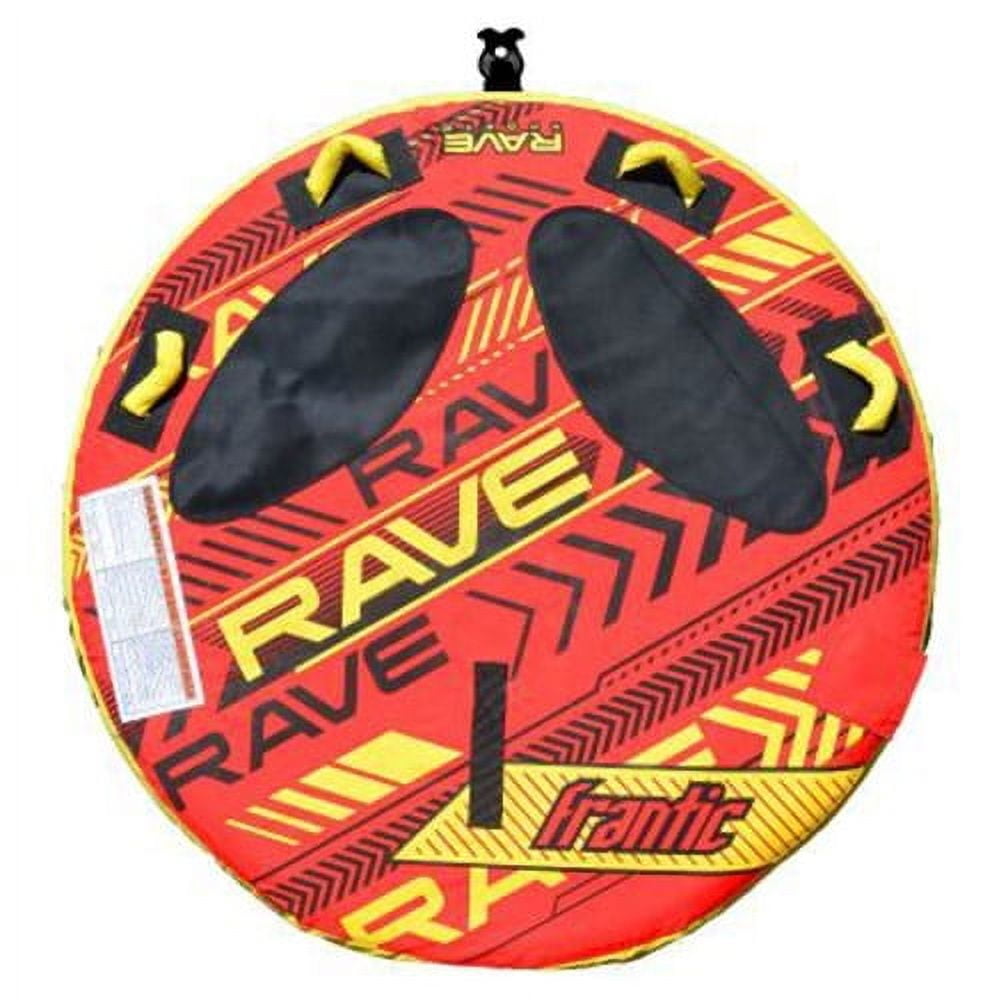 $94.59Red and Yellow Frantic 2 rider towable tube with a 56″ diameter (inflated) tapered profile, (6″ -12″) FOUR foam filled, tubular PP webbing handles with EVA knuckle guards. Tapered side gusset panel all around Quick Connect Tow System with triple reinforced stitching Two EVA anti-chafe pads Single rear boarding strap Flap cover over valve opening Self bailing cover drain on bottom.