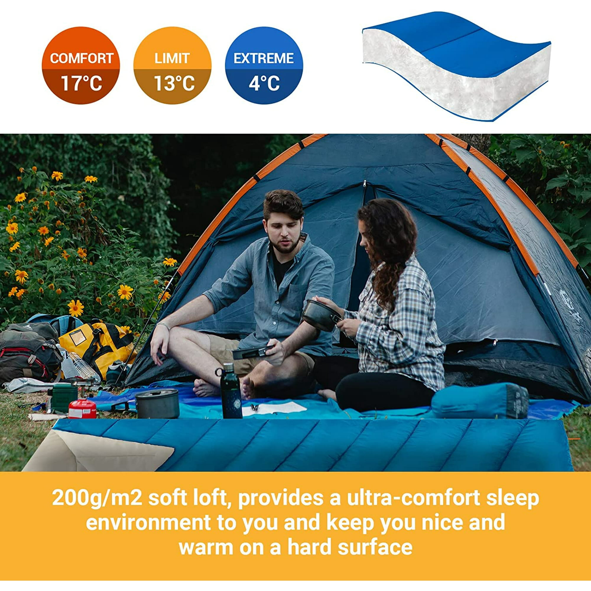 $60.19Original price was: $60.19.$38.69Current price is: $38.69.Our double wide sleeping bag with pillows can turn into 2 single sleeping bags, creating a comfortable sleeping environment for each other.The weight of portable sleeping bag is 2.8kg/6.1lbs, and the folded size is 19.6 X 10.6 inches. comfort temperature range from 55.4°F to 62.6°F. Extreme use down to 39.2°F.The sleeping bag for outdoors is made of tear-resistant and waterproof 100% polyester 190T, filled with 200G/M2 imported warm hollow cotton. The camping sleeping bag is breathable and warm, fluffy and light, and environmentally friendly.The upgrade zipper of the sleeping bag with anti-clogging strips is self-locking to prevent unintentional opening. There are two inner pockets on each side of the sleeping bag to store small items when the family goes out.The adult sleeping bag is also designed with wind deflectors for warmth and comfort.