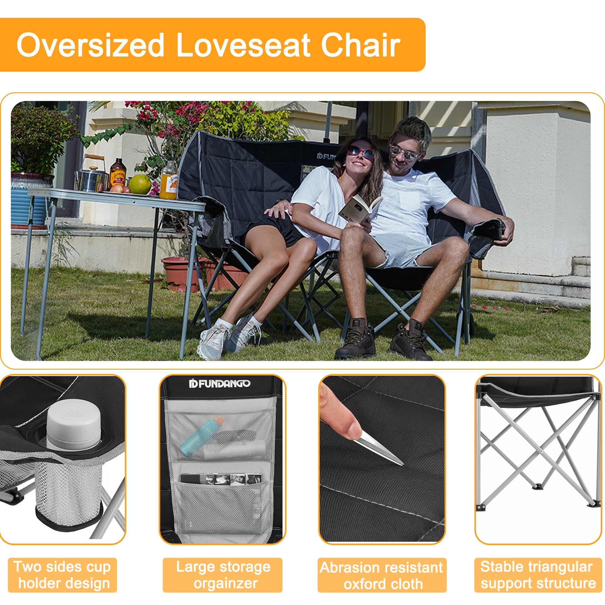 FUNDANGO Loveseat Camping Chair 2Person Portable Folding Outdoor Chair for Adults Oversized Camping Couch with Cup Holder, Support 400lbs, Black/Grey