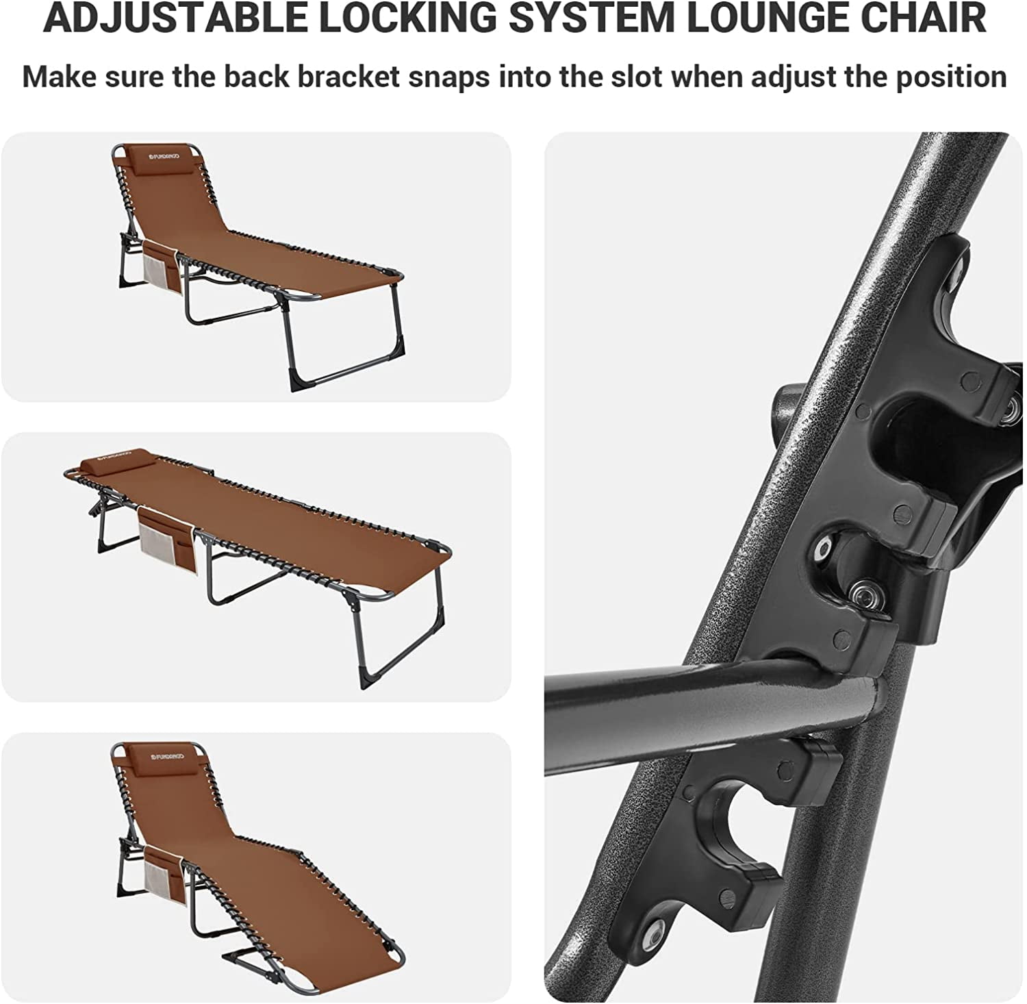 FUNDANGO Outdoor Folding Chaise Lounge Camping Chair, Adjustable Reclining Design with Pillow, High Weight Capacity (265lbs), Perfect for Beach & Pool, Khaki