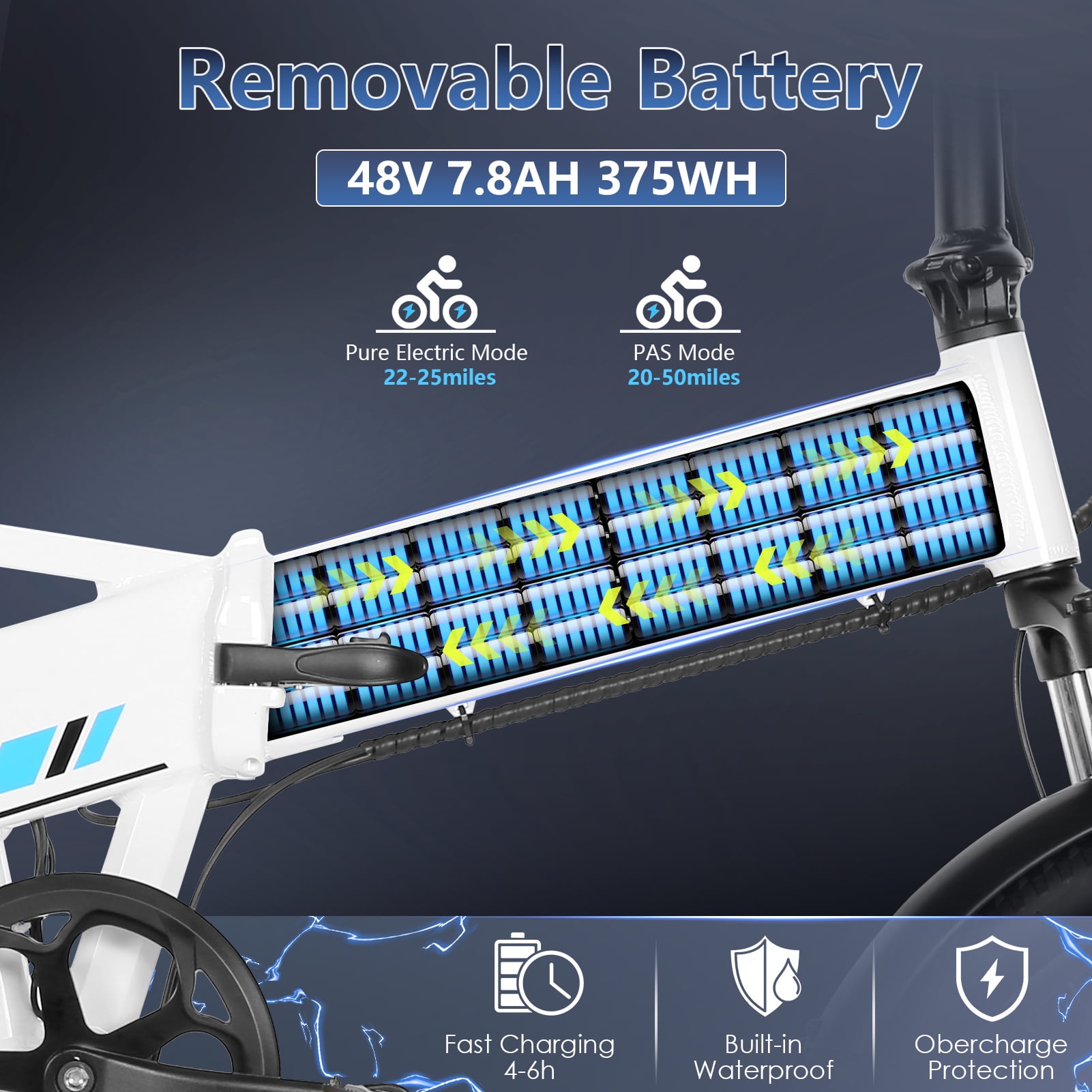 $455.79GOCIO PEAK 750W Foldable Electric Bike / 375Wh 48V Electric Bicycles for Adults Man Woman / 50+ Miles Range Commuter E Bike / 20MPH Adjustable Electric Hybrid Bike / 20″ * 2.4 Fat Tire Ebikes Main Features: Peak 750W Powerful Motor: The adult electric bicycle is equipped with a 500W 48V rear brushless motor (peak 750W), reaching a top speed of 20 mph. With 50Nm of torque, the Ebike provides strong climbing power,,making it suitable for various terrains, including city road, sand, snow, and beach. 375Wh Built-in Removable Battery:The 48V 7.8Ah removable high-capacity battery (UL 2849 certified) offers up to 20-35 miles in pure mode and 35-50 miles in PAS mode.The built-in battery is stylish and secure, featuring IP65 waterproof and BMS protection for safe use in any weather, enhancing protection and convenience. Lightweight 、Safe & Comfortable:The electric bikes, made from lightweight aluminum alloy, can be easily folded in 2 steps to fit into your trunk. The handlebar and seat heights are adjustable to accommodate riders of different heights. The lockable front fork provides a smoother riding experience, while the brake tail light and dual disc brake system ensure your safety. Versatile Riding Experience: This e bike is equipped with 2.4″ wide tires, which are wider and thicker than other 20-inch tires, offering better grip and improved shock absorption. Offering 5 riding modes and combined with the Shimano 7-speed gear system, this e bike delivers a versatile riding experience suitable for commuting, off-road adventures, and outdoor cycling. Multifunctional Practical Design: The upgraded LCD display provides various data such as mileage, battery level, and speed. The bright front light and brake tail light ensure your safety during night rides.The quick-release front wheel allows for easy removal and installation, making transportation and storage hassle-free. Service Available The electric bike is 85% pre-assembled, assemble tools is inculded in the package. You can contact our customer service to get the installation video. We will generally reply to you within 24 hours.
