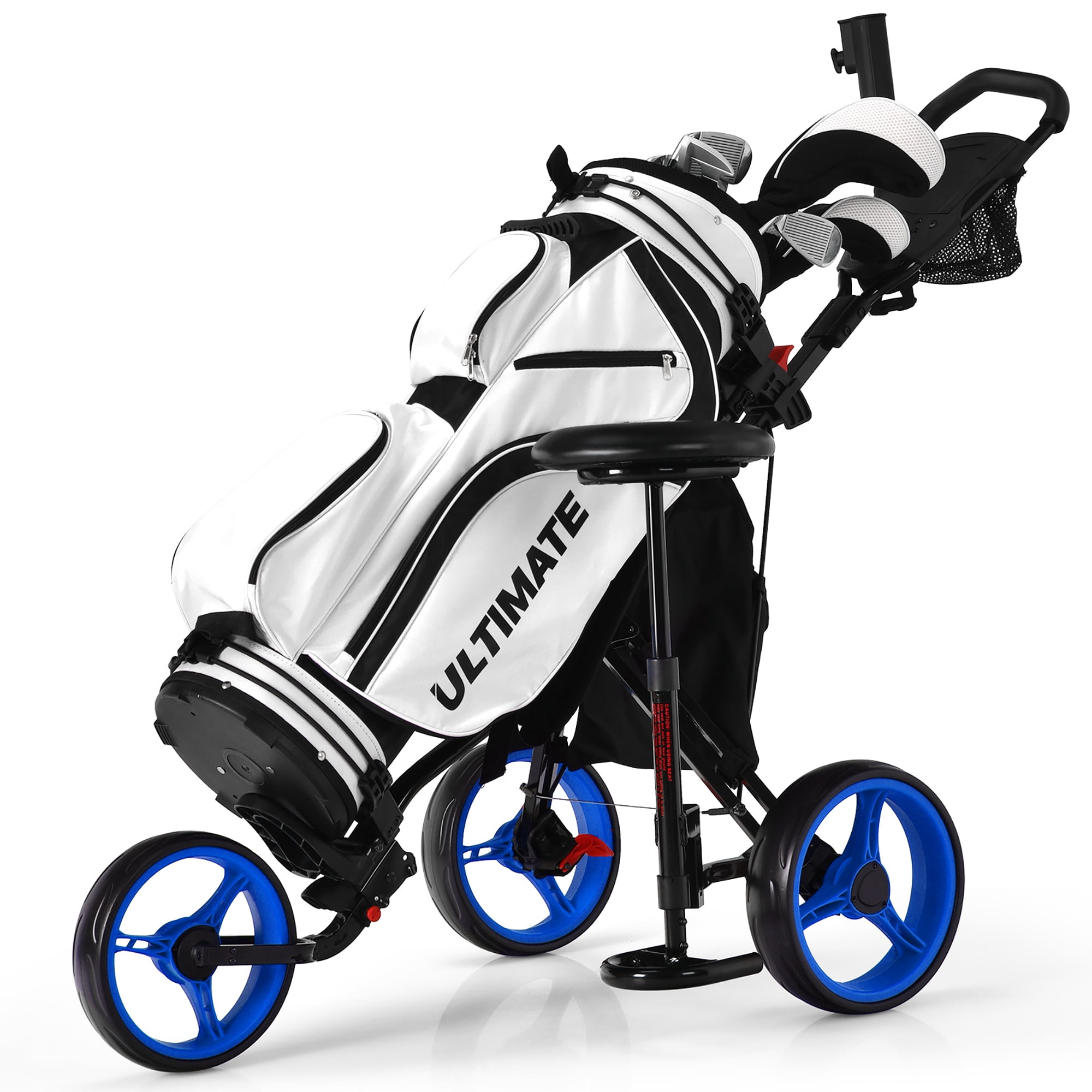 Goplus Folding 3 Wheels Golf Push Cart W/Seat Scoreboard Adjustable Handle Blue