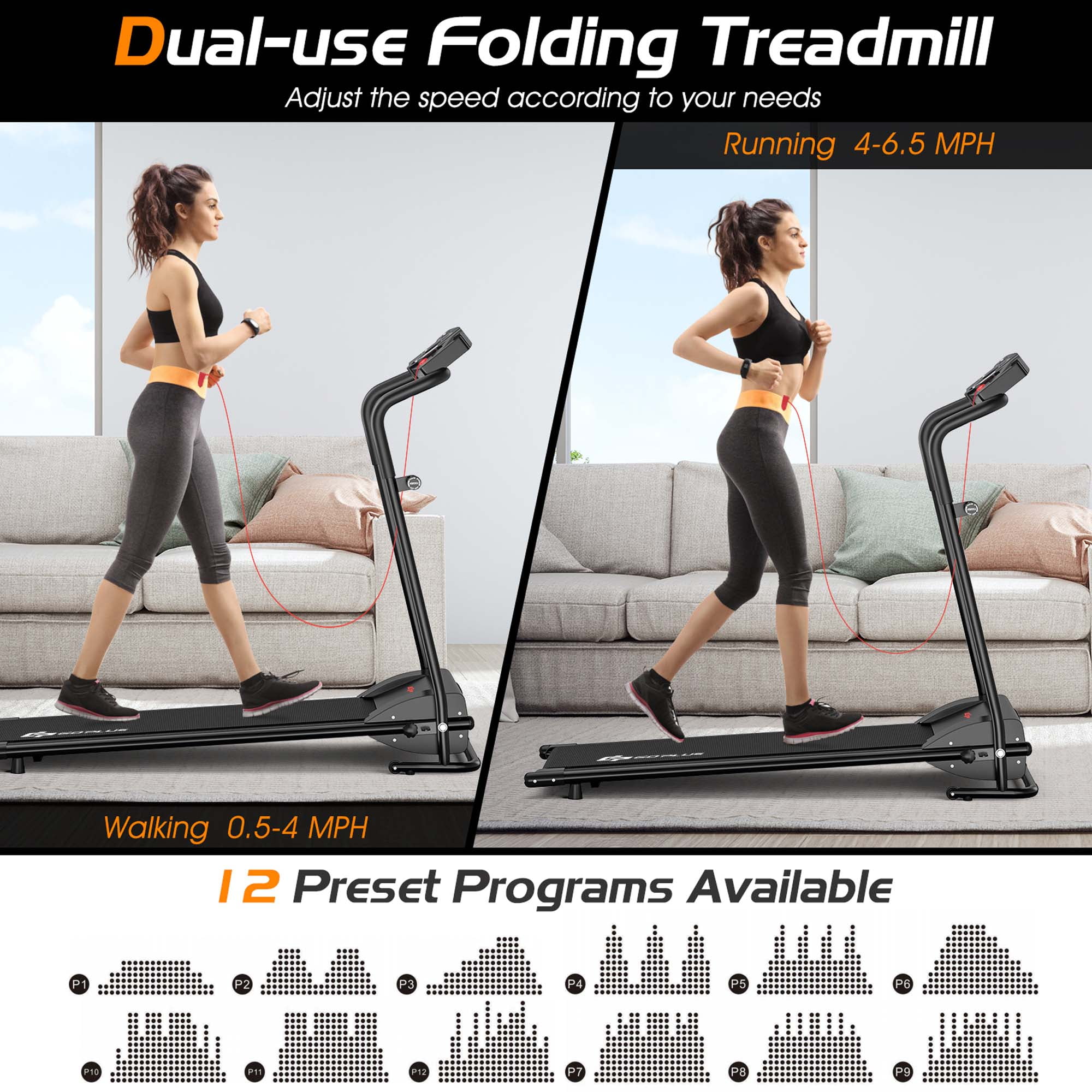 $189.19No time For gymnasium With this high-quality foldable and easily operated treadmill your home is your gymnasium.This Goplus Folding Treadmill Is Ideal For Everyday Running Workout Fitness. It Features Easy-Fold Design For Easy Storage And Heavy-Duty Steel Frame. You Could Take Exercises At Your Home Without The Hassle Of Going To The Gym. Keep Running And Burn Calories To Keep Fit And Enjoy A Healthy Life. Welcome! Note: 1.Simple Assembly Of The Portable Treadmill Is Required. 2.Please Refer To The Included Instruction Of The Treadmill Carefully Before Using Or Folding. 3.It Is Not A Gymnasium Product. The Size Is Only Designed For Home Workout. 4.There Is A Small Bottle Of Silicone Oil Inlcuded In The Package, Which Needs To Be Used On The Runway To Avoid Friction And Noise Every Three Months. 5.It Is Designed For Household Only. The Treadmill Size Is Smaller Than The General Size In Gymnasium. Feature Heavy-duty construction Multi-function LED display LED Mode: Heart rate, scan, speed, distance, time and calories Handrails have speed +/-, start/stop and heart rate test functions Safety guaranteed: easy to reach emergency stop switch Home exercise, portable and convenience With IPAD/mobile phone holder Folding design for easy storage Extremely low noise motor video: Specification Material: Frame: Heavy-duty steel Control panel: ABS Running belt: PVC;Rated power: 1100W LED display screen: Heart rate/Speed/ Distance/ Time/ Calories/ Scan Modes:P1-P12;Rated voltage: 110V Rated frequency: 60Hz Speed: 0.8-6.0 mph Inclination:4° Runway size:39”x14”(LXW) Overall Assembly Size: 49.6”x24”x46.5”(LXWXH) Folding Size: 22.3”X24”X48”(LXWXH) Weight: 59 lbs;Weight Capacity: 220 lbsPlug Type: US Standard Package Includes:1 x 1100W Treadmill
