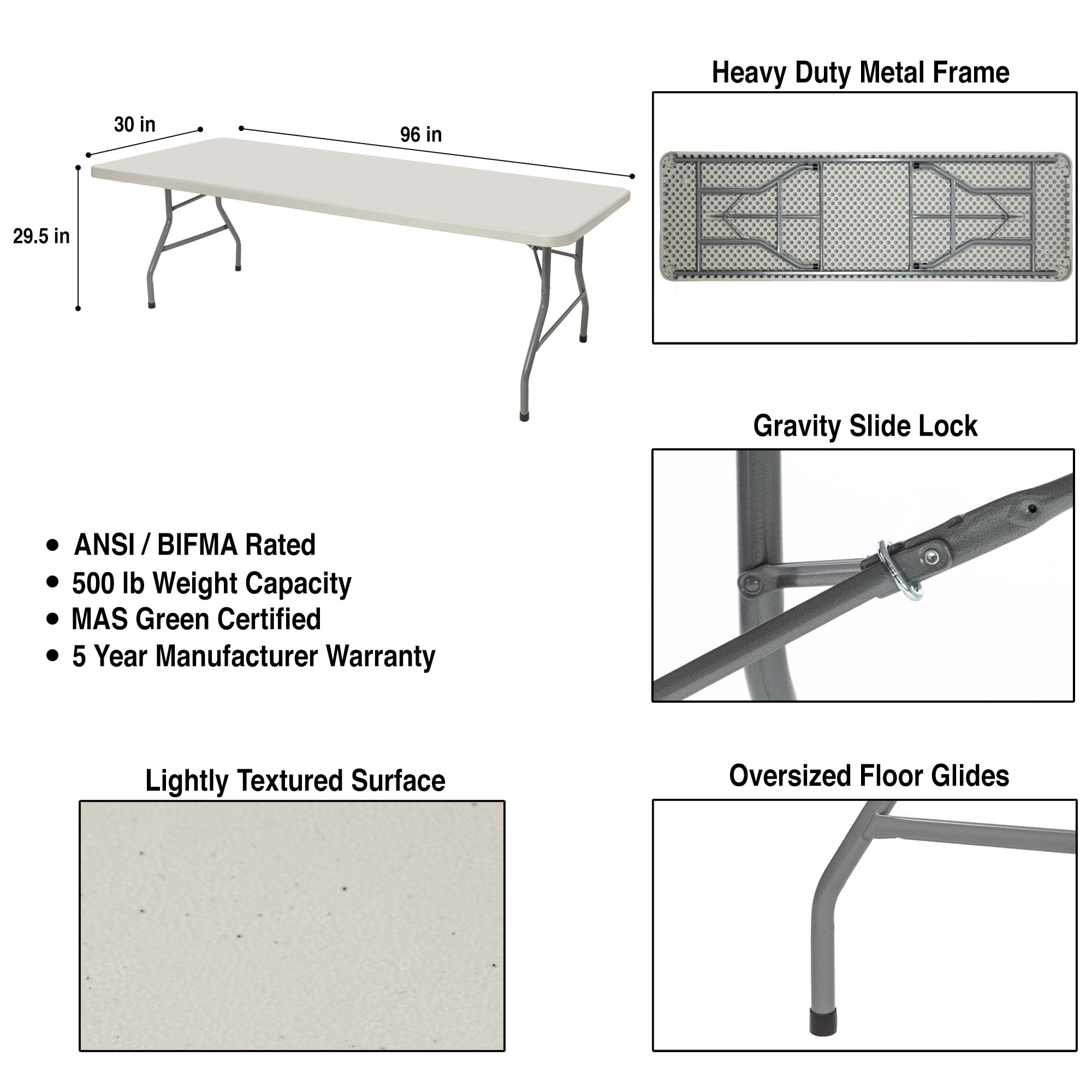 $154.80The Baldwin 30” x 96” Folding Table is the perfect solution for banquet and cafeteria use! This versatile table is suitable for indoor or outdoor use and is perfect for a variety of applications. Use it in your home for everything from large family dinners to game nights and craft projects Bring it to your small business or coworking space for a convenient and comfortable workspace that can accommodate a large group Set it up at your next outdoor event for a sturdy and weather-resistant surface that can seat a crowd Some other great features of the Baldwin 30 x 96 Folding Table include: A scratch-resistant, heat-resistant tabletop that can hold up to 800 lbs A sturdy and stable steel frame with a textured powder-coated finish A rectangular shape that provides plenty of space for all your needs A lightly textured surface that’s smooth enough for writing Wishbone-style legs with gravity slide locks for extra stability A 1 year warranty for peace of mind Don’t wait any longer, add the Baldwin 30 x 96 Folding Table to your space today and start enjoying all the benefits it has to offer!