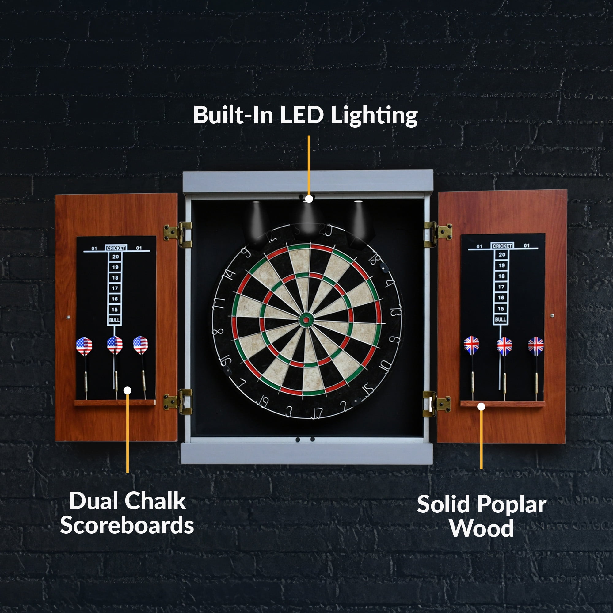 $127.37Light up your game with the Geneva Dart Cabinet Set. Featuring a built-in, LED lighting system, the Geneva Dart Cabinet will add authentic pub-style to your game room, man cave, or office. Constructed from high-quality, engineered wood, this cabinet will stand up to a lifetime of play. A modern, gray, and wood grain melamine finish resist cracking or splitting. Keeping score is easy with two scoreboards conveniently mounted on the interior of each door. Integrated dart holders keep your darts neatly stored when not in use. Comes complete with a regulation-sized, sisal dartboard and six steel-tipped darts. All you need to do is mount the dartboard cabinet and play.