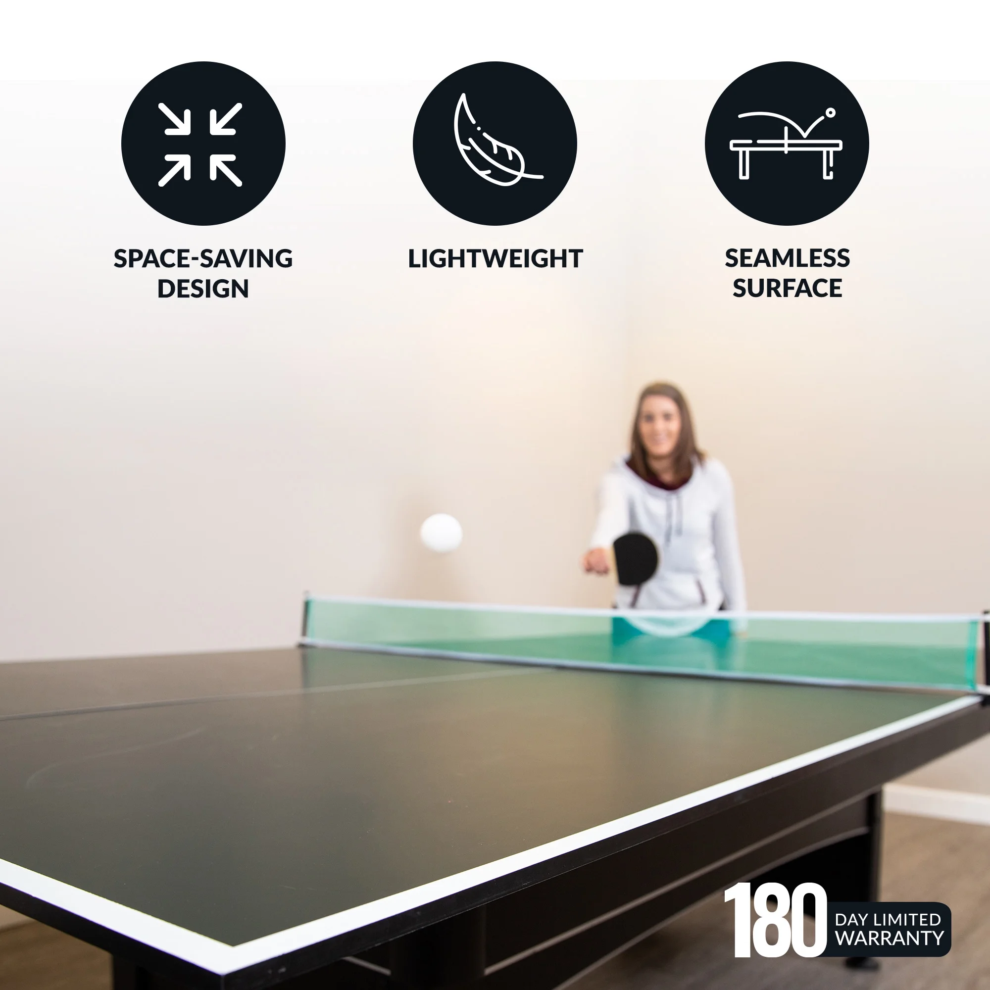 $232.16Original price was: $232.16.$155.33Current price is: $155.33.Convert your pool table into a regulation-sized table tennis table. Featuring a ½-in thick, engineered wood surface covered in a classic, green, PVC laminate, this conversion top provides consistent ball bounce and prevents warping. The underside of the table is cushioned with felt pads to protect against scratches or sliding. Its 4-piece hinged design makes set up quick and easy. Simply attach the included posts and net and you’re ready for fun with family and friends. Recommended for use with a 7-ft or 8-ft pool table.