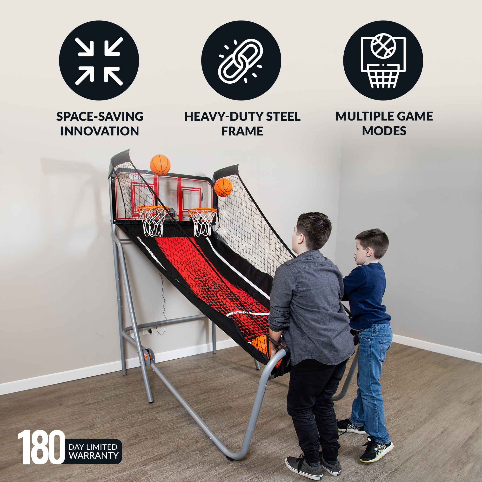 $221.87Original price was: $221.87.$179.71Current price is: $179.71.You can bank on this game to last! The Shot Pro Deluxe Arcade Style Basketball Game brings the excitement and thrills of basketball into the privacy of your own home! Unlike other home style basketball games, this commercial-grade game is built to last. It features a heavy-duty, 1.75-in diameter, rigid steel support frame. The sturdy acrylic backboard includes two heavy duty 12-in rims with built-in electronic scoring levers for automatic, accurate game scoring. The electronic scoring unit features 8 exciting game options and keeps track of the game time. This basketball game will provide hours of fun and competitive play for the whole family. When you’re done playing, simply fold the Shot Pro into a space saving position for easy storage. 180-day limited warranty.
