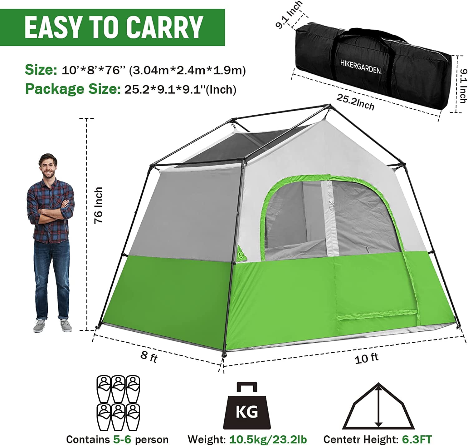 HIKERGARDEN 6 Person Camping Tent – Portable Easy Set Up Family Tent for Camp, Windproof Fabric Cabin Tent Outdoor for Hiking, Backpacking, Traveling