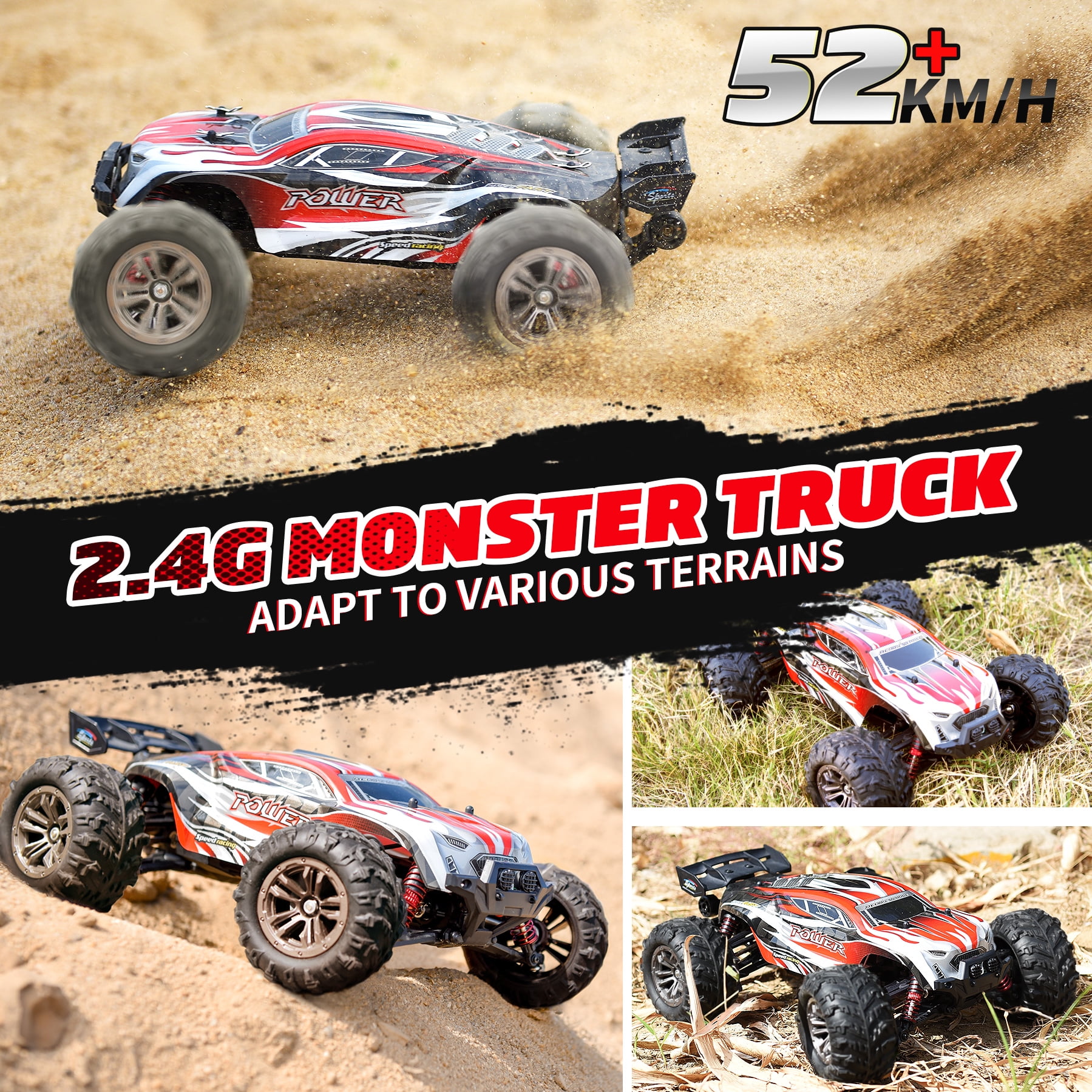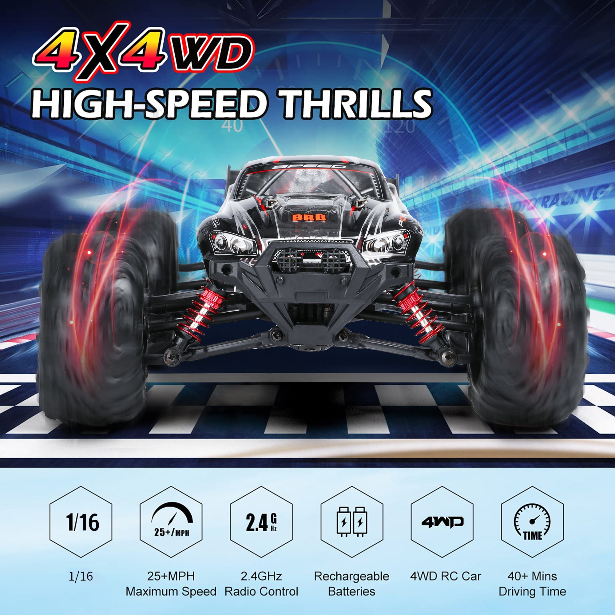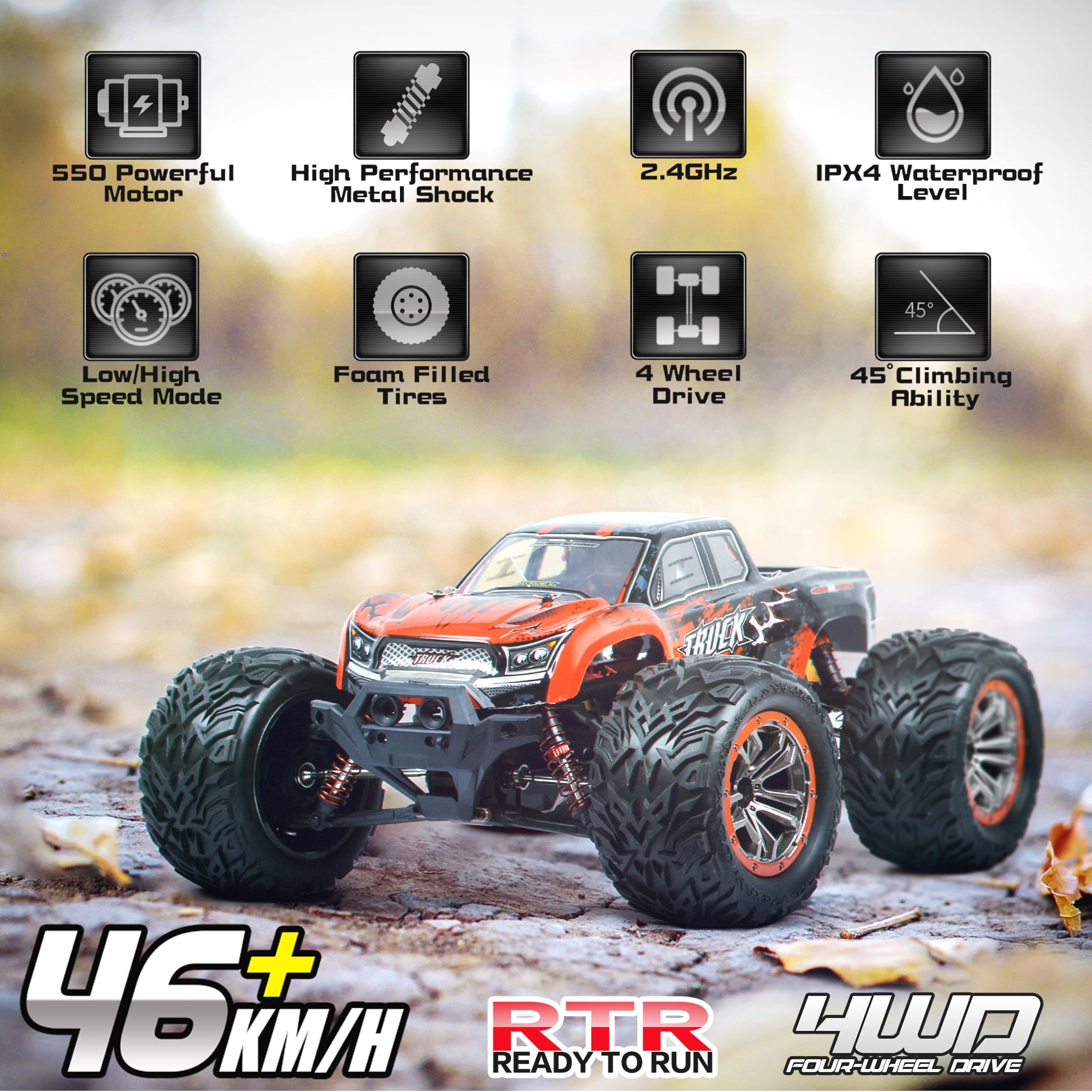 $48.14Fast Speed & Heavy Duty Wheels Comes with the aggressive tread of the strong grip tires, you can go both off-road and on-road environments with premium anti-skid heavy duty wheels. All Terrain & IPX4 Waterproof Feature This All Terrain RC Car has no problem going through the sand, grass,wet mud and marshy land, easy to finish and enjoy lots of difficult movement. With the semi-waterproof feature, allowing for play in any weather. Full Function Professional Steering Great off-road performance, strong and durable,perfect for specialized operation, like turn, drift, and flip,built for superior handling and control, Forward/Backward, Left/Right . Strong Shockproof Resistance Heavy duty wheels & Anti-shock Suspension System Due to its hollow rubber tire with shockproof gaskets, this 1:16 scale monster truck boasts extraordinary grip and operation. 4-Wheel Drive and All Metal Sealed Ball Bearing Four wheels are installed independent suspension spring let cross-country car body more flexible, easy and difficult, also played the shockproof function for the body to protect the electronic components inside the car body. 2.4Ghz Radio System and Long Remote Distance Work off 2.4GHz frequency with anti-jamming capability allows to race more than 10 cars at the same time, the same area and up to 80m/262ft remote control. Specifications Scale: 1:16 Speed: 36 Km/h Frequency: 2.4GHz Control Distance: 80m Running Time: About 16 mins at full speed Charging Time: 2.5 hrs Charger: USB Charger Motor: Strong magnetic carbon brush motor Truck Battery: 2 x 7.4V/1500mAh battery pack (included) Remote Battery: 3 x 1.5V AA battery (NOT included) Dual Batteries Connector Age Range: More than 8 Years old Protection: Stuck Protection, Thermal protection on PCB, Over-discharge protection Function: Forward, backward, turn left, turn right, drift, brake, can climb over obstructions. Package Included: 1x 1:16 Monster Truck 1x 2.4G Transmitter 2x 7.4V 500mAh Battery Pack 1x USB Charger 1x User Manual