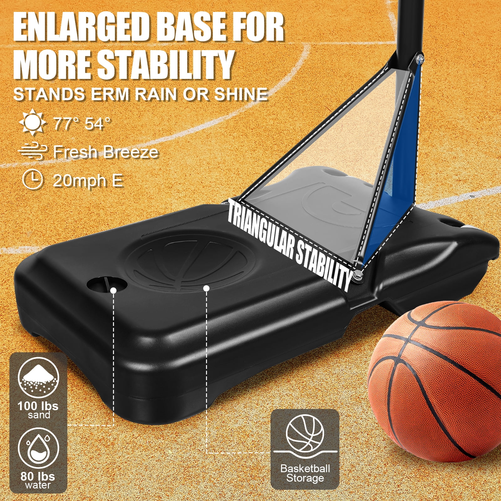 $111.79This portable basketball system from HooKung have an Action Grip height adjustment mechanism that adjusts from 6.2 to 8.5 feet high. The backboard size is 35.4’’X23.6’’,it can meet our needs indoors.Weatherproof and durable materials that have been manufactured from one of the quality plastic (PC). A steel main pole, an all-weather nylon net, no doubt it can endure your strongest slam dunks.It is easy to assemble and disassemble.You can bring this youth basketball hoop with stand wherever you go. No need for you to postpone fun. This is a perfect outdoor and indoor game that you can put the basketball stand in the courtyard, driveway, poolside, square, park,and other places, so that you can play with it anytime. Of course, don’t worry,the base size is 35.4’’X 23.6’’X 6’’,the base can be filled with 65kg water or 70kg sand to ensure good stability and safety for your every shot. Its portability also allows for you to bring to your neighbors and create a full court if they also have a Basketball Hoop which can make for tons of fun. So bring the arena to your home with a residential basketball system.