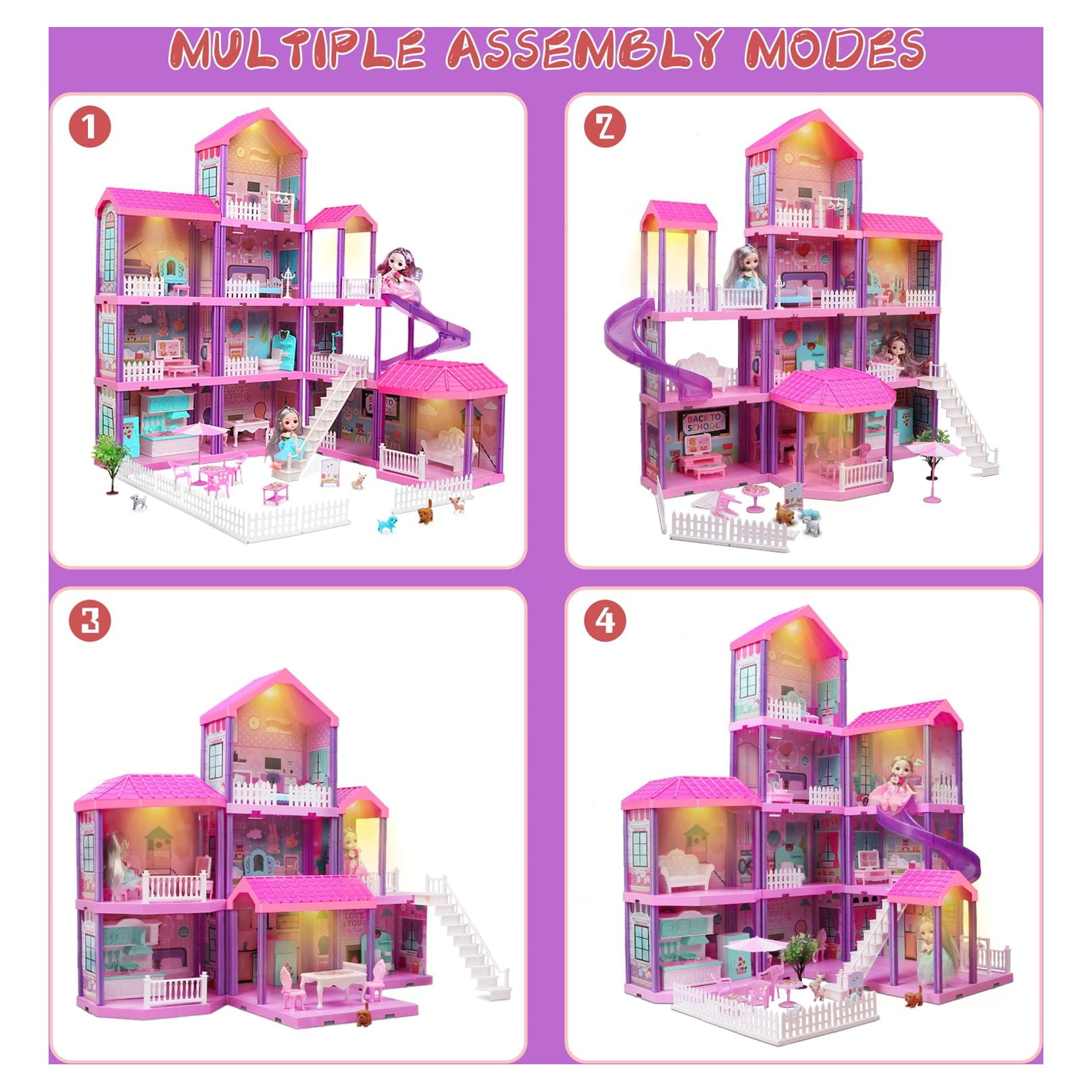 $103.19Hot Bee GORGEOUS DOLLHOUSE – GREAT GIFT FOR LITTLE GIRLS ! Description Perfect Christmas or birthday gift for girls kids/toddlers age 3,4,5,6,7,8. At Christmas, you can also put the dollhouse as Christmas decorations and your Christmas village together to become the perfect decoration under the Christmas tree. 11 ROOMS OPEN DESIGN DOLLHOUSE Full-featured dollhouse for girls, including living room, bathroom, dining room, bedroom, kitchen and other rooms, with fully furnished. The miniature house kit equips many exquisite dollhouse furniture, giving kids more creative possibilities. Children can move and arrange freely according to their preferences. Have an outdoor activity area and a slide, allowing the dolls to enjoy the leisure courtyard time. Children can invite friends to role-play together. They will be immersed in this dream journey. WHAT CAN YOU GET? Specifications: Room: 11 Warm Lights: 4 Pack(including batteries) Material: Premium ABS+Plastic Recommended Age: 3+ TIP: All furniture and accessories are shown in the pictures Doll Size: 5.9 inches Key Feature