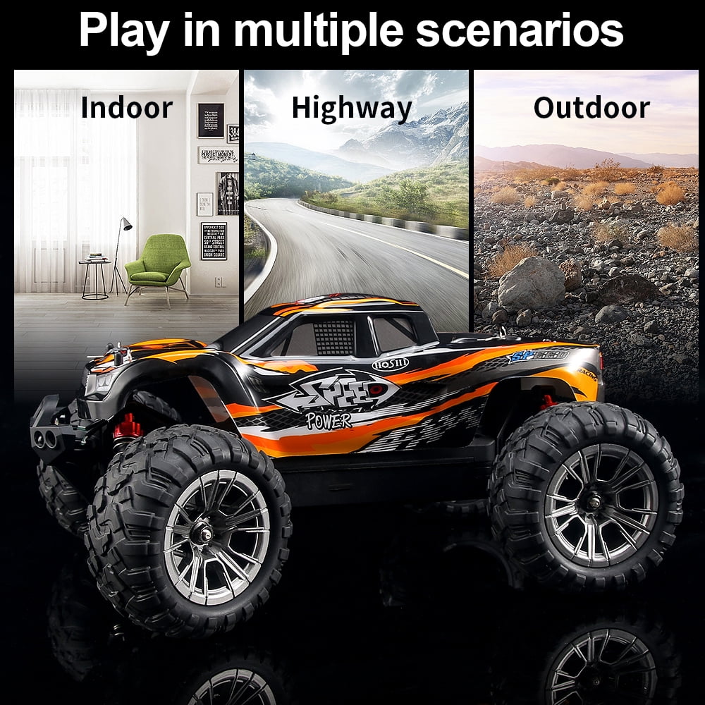 $68.79550 More Powerful Motor The RC Cars With 550 powerful motor, more stronger and durable,perfect for specialized operation, like turn, drift, and flip,built for superior handling and control. High Toughness PVC Car Shell With High Toughness PVC Car Shell monster truck, all good quality material are special designed for tough environments and any rugged roads. Led Light Gives an extra effect to your RC trucks especially when you play with it in a darker area. Gift Fireproof Lipo Safe Bag A must Have for Safety! The lipo bag is made of a fire-retarding material. You may place the battery in the bag while charging or use it as a storage. If you have any problem or question about our products, Please feel free to contact the after-sales Team . we will always stand behind our products to work with you to make this right. The rc monster trucks with 2 different speed mode ( Full Speed and Half Speed Mode) Transmitter Switch on H : Full Speed Mode (the speed is about 46km/h) Transmitter Switch on L : Half Speed Mode (the speed is about 23km/h) Hosim Remote Control High-speed Off-road Truck Package Includes: 1 * RC Truck 1 * 7.4V 1500mAh Battery 1 * USB Charger 1 * Transmitter (Battery not included) 1 * Explosion-proof Bag 1 * rc cars led light 8 * Body Clips 4 * Wheel Nut 1 * Screwdriver 1 * Wrench 1 * User Manua