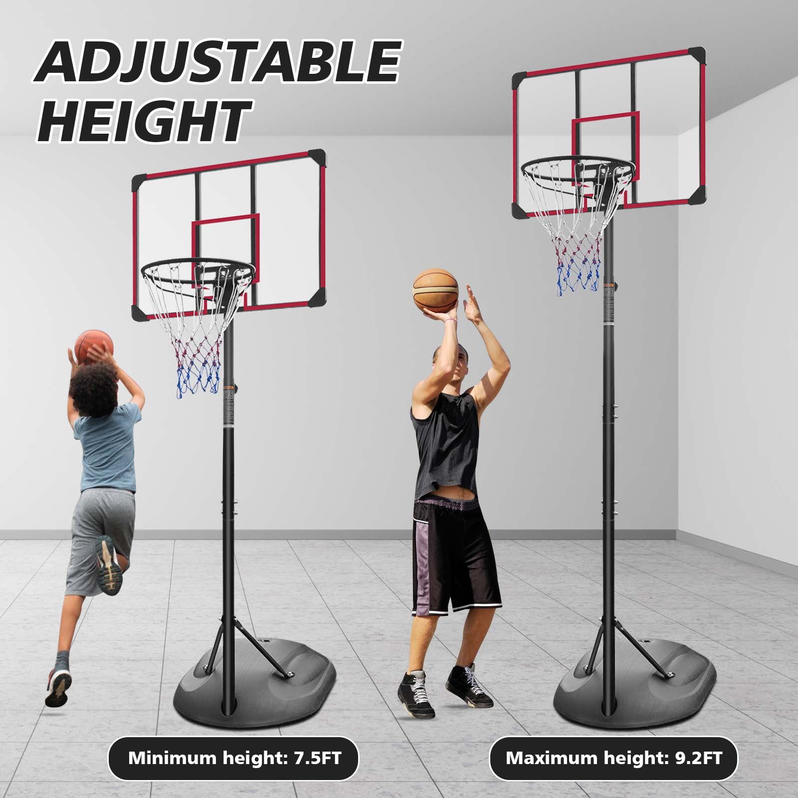 $68.79This portable basketball system from HooKung have an Action Grip height adjustment mechanism that adjusts from 5.48 to 7.48 feet high. The backboard size is 32’’X23’’ ,it can meet our needs indoors.Weatherproof and durable materials that have been manufactured from one of the quality plastic (PE). A steel main pole, an all-weather nylon net, no doubt it can endure your strongest slam dunks.It is easy to assemble and disassemble.You can bring this youth basketball hoop with stand wherever you go. No need for you to postpone fun. This is a perfect outdoor and indoor game that you can put the basketball stand in the courtyard, driveway, poolside, square, park,and other places, so that you can play with it anytime. Of course, don’t worry,the base size is 32’’X 23’’X 6’’ ,the base can be filled with 35kg water or 40kg sand to ensure good stability and safety for your every shot. Its portability also allows for you to bring to your neighbors and create a full court if they also have a Basketball Hoop which can make for tons of fun. So bring the arena to your home with a residential basketball system.