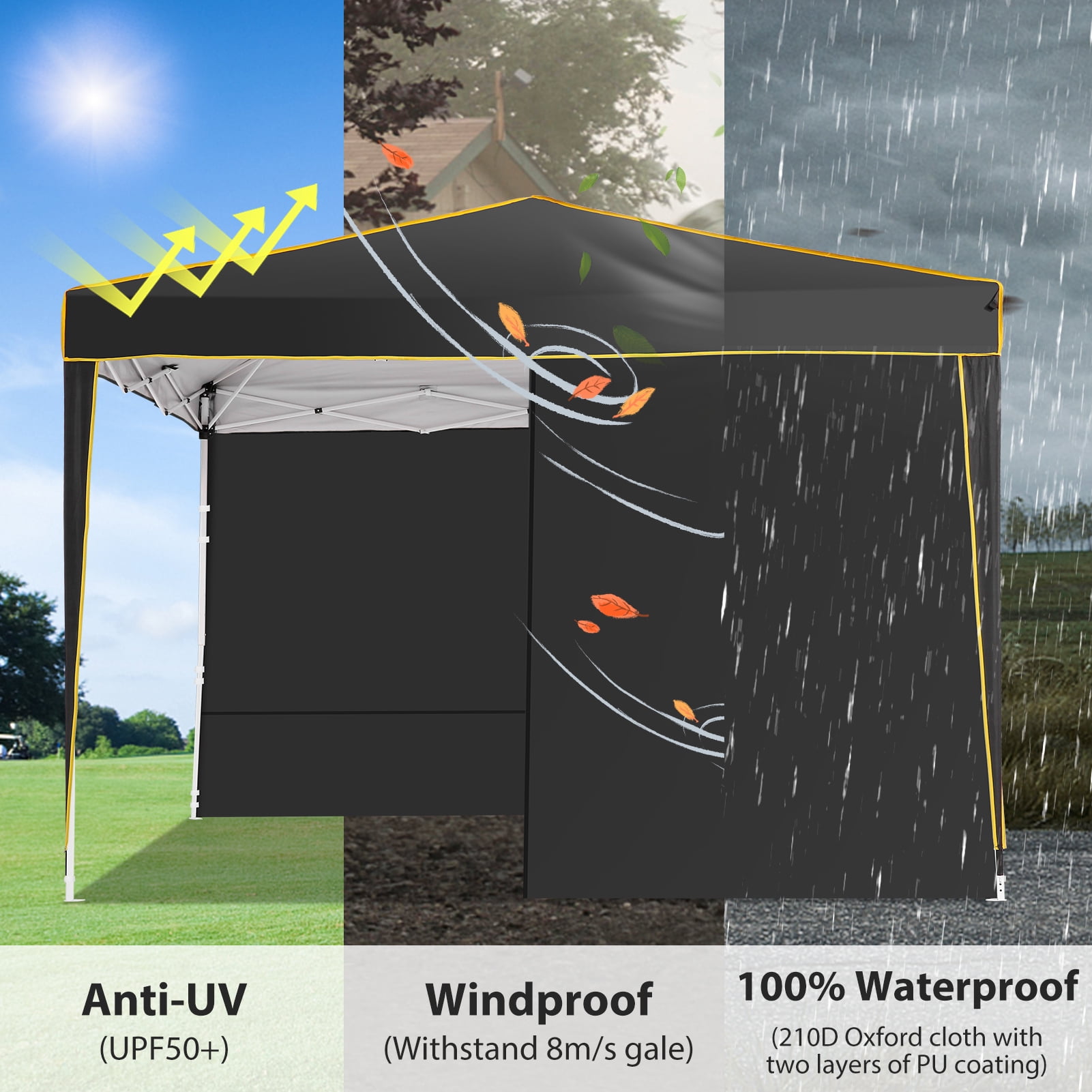 $94.59Original price was: $94.59.$65.54Current price is: $65.54.Main Feature 🔹【Easy Setup & Portability】Our Ez up canopy tent comes fully assembled, making it effortless to set up without any tools. Just one or two people can assemble it in minutes. It also includes a portable carrying bag that fits most cars for easy travel convenience. 🔸【Sturdy Frame & Premium Fabric】Built with a thick steel frame featuring anti-rust powder coating and a full truss structure for ultimate durability. The canopy top is made of 210D oxford fabric with premium UV coating, offering standard UPF 50+ protection to block out 99% harmful UV rays. It’s also waterproof, enhancing the comfort level of your backyard or patio. 🔹【Adjustable Height Settings】Choose from three different height settings (High, Medium, or Low) to meet your specific needs. With heights ranging from 97.2″ to 104.4″, and a straight leg design providing 100 square feet of shadow area, it’s perfect for outdoor event shelters or commercial activities such as farmers markets, backyard gatherings, camping, weddings, festivals, beach outings, sports events, family parties, and BBQs. 🔸【Versatile Wall Configuration & Stability】Our instant canopy comes with four sidewalls—two with church windows for added light and two with zipper doors for easy entrance. Sidewalls are removable, allowing you to customize the setup according to your preferences. Additionally, four sandbags, stakes, and ropes enhance stability, ensuring sturdiness even on windy and stormy days. 🔹【Package Contents & Customer Service】The package includes a 10×10 pop-up canopy tent, four sidewalls, a carrying bag, four stakes, four ropes, and four sandbags. If you have any questions or concerns, please feel free to contact us. We are dedicated to providing exceptional customer service and assistance.