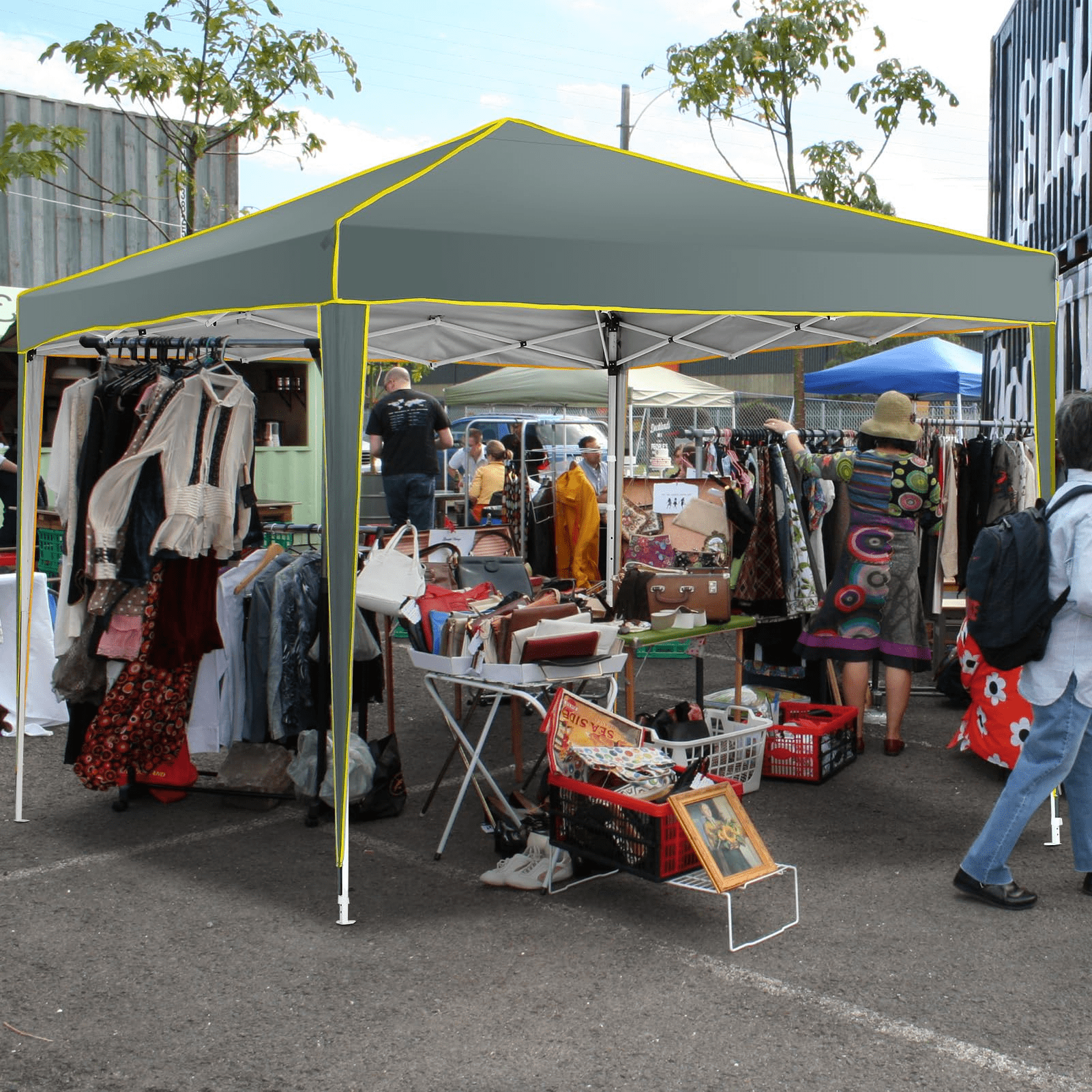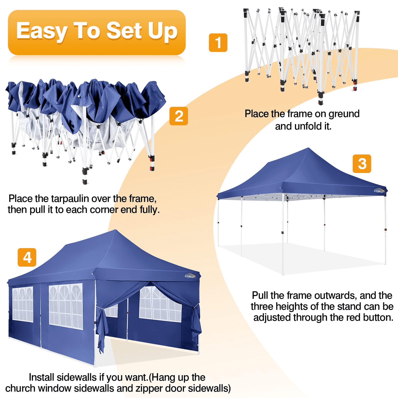 $283.79Original price was: $283.79.$197.79Current price is: $197.79.10×20 POP UP CANOPY WITH 6 REMOVABLE SIDEWALLS 【Host Large Events with Ease】: Our extra-large 10x20FT canopy with sidewall and raised roof comfortably accommodates 10-15 people for dining or gathering.The attached 4 side church windows and 2 zippered side walls provide easy access and unobstructed views. Perfect for outdoor event shelter or commercial activities in farmers market, backyard, patio, festivals, beach, sports events, family parties, BBQ. 【Sturdy Frame & Durable Fabric】This pop up canopy with sturdy full truss structure design, made of thick steel frame with anti-rust powder coating. The canopy top is made of 210D oxford fabric with premium UV coating and be attached with waterproof strips, standard UPF 50+ that blocks out 99% harmful UV and water. 【Upgraded 3-Height Settings】Three different height settings allow you to choose the height that meets your need of the scene (the height is 109.9″ /114.7″/117.9″respectively). Straight leg design provide 200 square feet of shadow area.When you need instant cover, this pop up tent will provide temporary shelter for you and your family or car. 【Easy to Set up & Take Down】Without any tools, the canopy can be used directly after unfolding. 1 or 2 person can set up in minutes. 6 ropes and 12 stakes enchance the stablity in windy and stormy days. 【Package included】Comes with all accessories. 1x tent, 6 x side walls, 4 x ropes, 12 x stakes, 1 x carry bag. If you have any problem about this tent,please contact us freely.