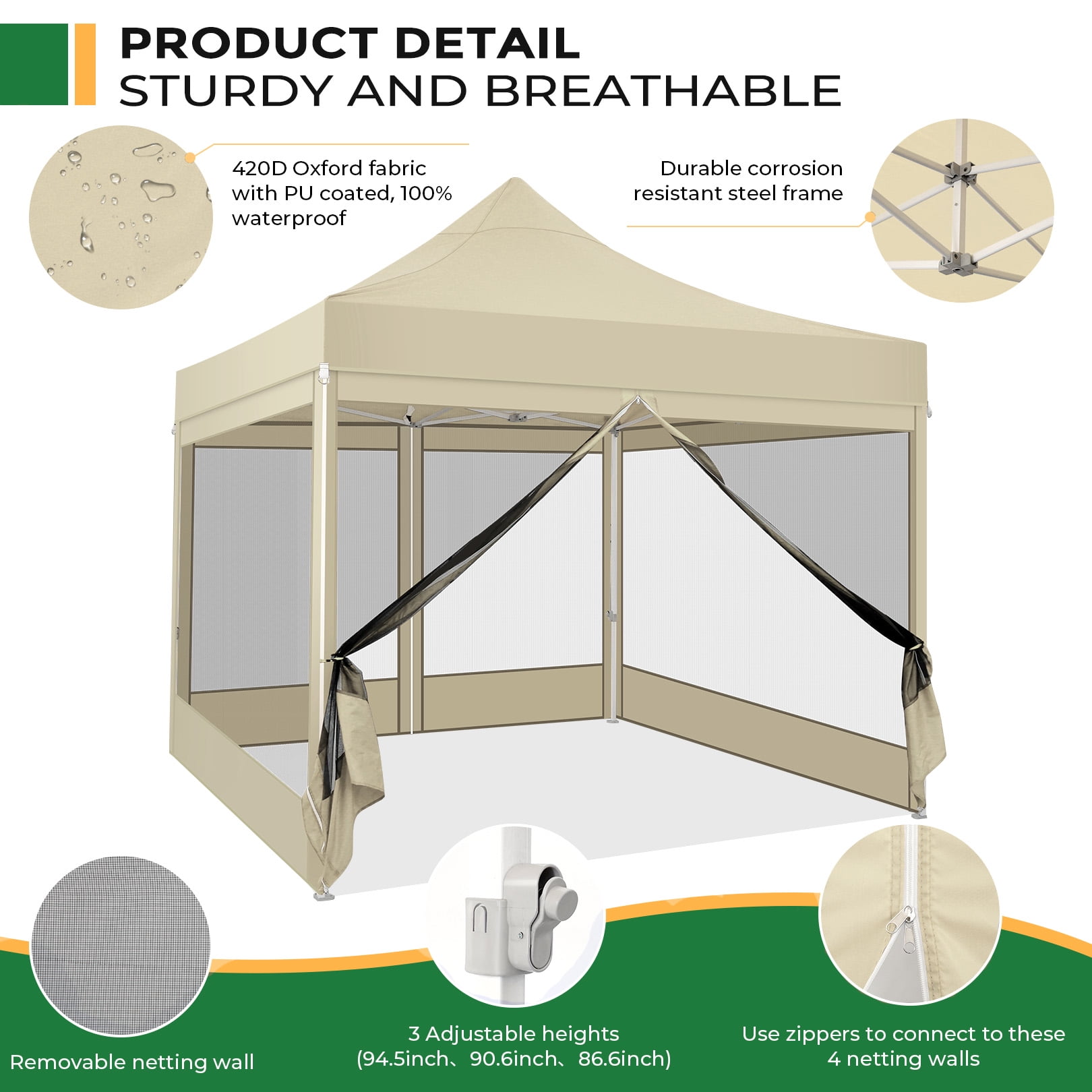 $232.19Original price was: $232.19.$116.95Current price is: $116.95.【Multifunctional & Removable Netting Sidewalls】The removable netting sidewalls design of this pop up gazebo allow you to breathe in the fresh air, feel the cool breeze, enjoy the view and fully experience nature while being free from mosquitoes. 10x 10ft canopy can provide 100 square feet of space for 8-10 people,suitable for a variety of occasions such as conducting parties, patio barbecues and exhibition activities. 【Commercial Grade Heavy Duty Frame】The sturdy full truss frame increases the load bearing capacity, stability and durability of outdoor tent for backyard. The tube diameter is 1.26”, while most regular tents are only 0.98” in tube diameter. The surface of the frame has anti-rust spray paint, you don’t need to worry about the rust of the bracket at all. 【Easy up Canopy Tent】This patio gazebo is easy and quick to set up and put down, 2-4 people can quickly set up this outdoor canopy in minutes without tools and fold it up when not in use. 【3 Adjustable Heights】The support poles of this pop up screen tent are designed with height-adjustable finger buttons, you can use it to adjust height (86’’ 90’’ 94’’) according to your needs. The height adjustable design allows you to share the same joy with your taller friends! 【Waterproof & UPF 50+】The top fabric of this screen house is made of 420D PU coated oxford fabric, which not only blocks 99% of UV rays, but also 100% waterproof (waterproof pressure is 2.1psi). The strong and non-tearable fabric can block the sunlight, rain and snow for you, suit all seasons.