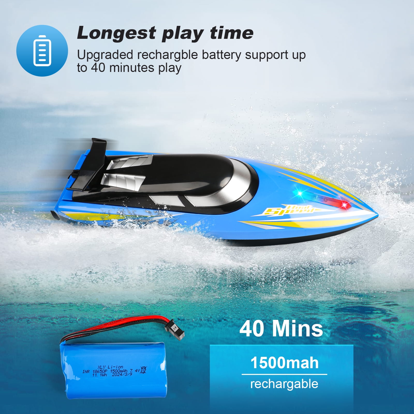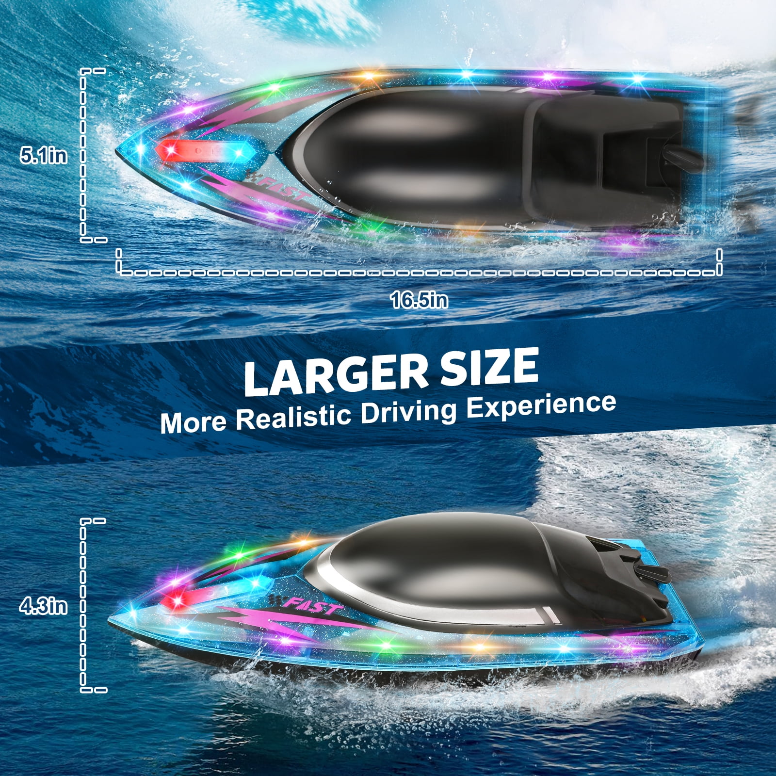 $94.59Original price was: $94.59.$51.59Current price is: $51.59.High-speed remote control boat for kids&adults adopts advanced 2.4G technology, so that multiple players can play at the same time without interfering with each other, and the remote control distance of more than 330 feet brings exciting game experiences to many players. Remote control toy boats can adapt to many water scenes and bring more entertainment to this summer. Function Introduction: 2 high-speed motors, ensuring high speed explosion Built in colored lights for controlling different functions the lights also change Omnidirectional proportional throttle The speed depends entirelyon the throttle command Collision protection head Avoiding injury/protecting the hull Durable and more playable Equipped with durable large module batteries for long-lasting battery life Effectively keeping the speed boat upright during driving,No need to worry about capsizing