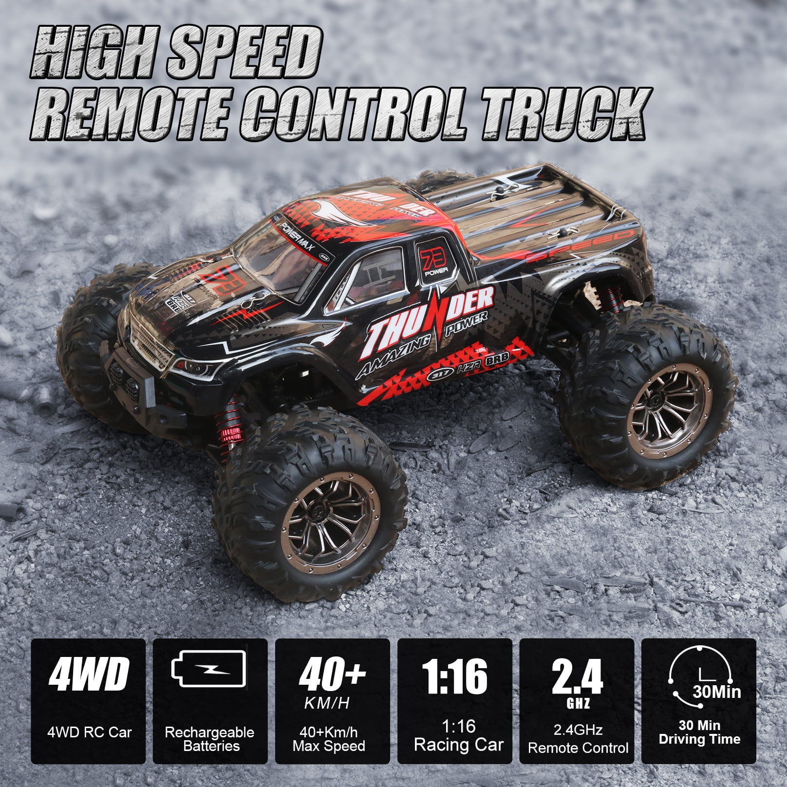Hot Bee Remote Control Car, 1:16 RC Monster Truck, 24+ MPH 4WD Off Road with Lights Gift for Boys Kids and Adults