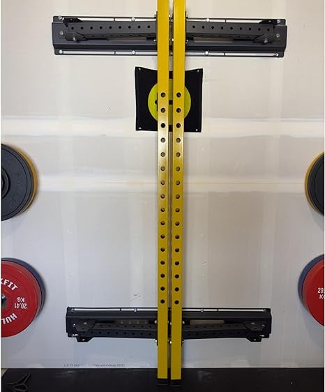 $282.94Add our space saving Wall Mounted Power Rack to your home gym fitness equipment collection. Designed to help you push your workouts toward your maximum potential with minimal space required. Requires mounting stringers onto drywall studs or concrete because it increases structural strength of the cage and will increase the weight capacity. This cage is painted yellow and black with a powder coated finish that reduces the risk of rusting. It folds away with a 4 way pin locking mechanism. The upright poles measure 2.35” x 2.35” x 86” and feature standard 2” hole to hole spacing. High density, rubberized feet help support the unit and reduce the risk of damage to your floor. Athletes and fitness enthusiasts can enjoy the benefits of body weight and strength training all in one package. Deadlifts, squats, lunges, and bench presses are a few weightlifting exercises you can do. Train for bodybuilding, , Powerlifting, Strongman, Strongwoman, Martial Arts, and more. We recommend adding Pro Series Spotter Arms, Y or U Dip Bars, Wall Mounted Barbell Storage, and more J Hooks to your rack for a more complete workout. The total weight capacity of this unit is 1,000 lbs.